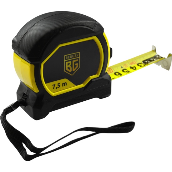 Рулетка ударопрочная BERGER BG1353, 25мм, 7.5мударопрочный эргономичный корпус (ABS- пластик; TPR – термопластичная резина) способен выдержать падение с высоты до 5 метров.двухсторонняя легко читаемая разметка.защитное двухстороннее нейлоновое покрытие увеличивает стойкость к износу в 10 раз.полотно рулетки устойчиво к заломам и перегибам.двухсторонний подвижный магнитный зацеп нивелирует погрешность в измерении.удобная усиленная клипса для ремня без острых кромок.ремешок для подвешивания.