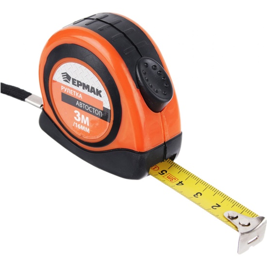 Рулетка ЕРМАК "Автостоп", двукомп. корпус, 3мх16ммРулетка ЕРМАК Автостоп, двукомпонентный корпус, 3мх16мм 658-120 предназначается для проведения измерительных работ. Надежный сматывающий механизм и корпус из ударопрочного пластика обеспечивают долгий срок службы инструмента.Комфорт в работе придают противоскользящие резиновые вставки, а для ношения предусматривается наручная петля и зацеп на ремень. Инструмент применяется в быту и строительстве.