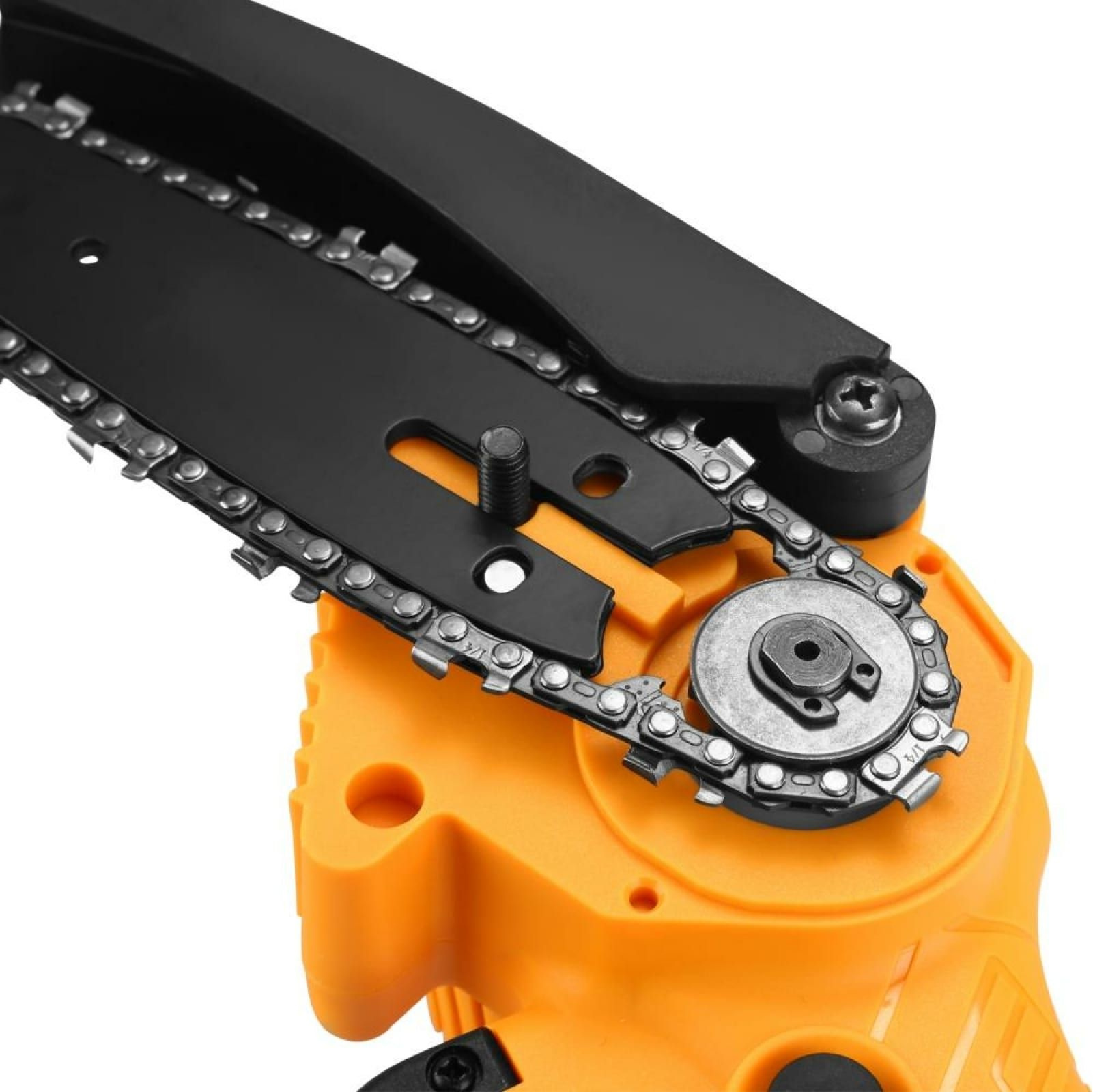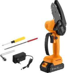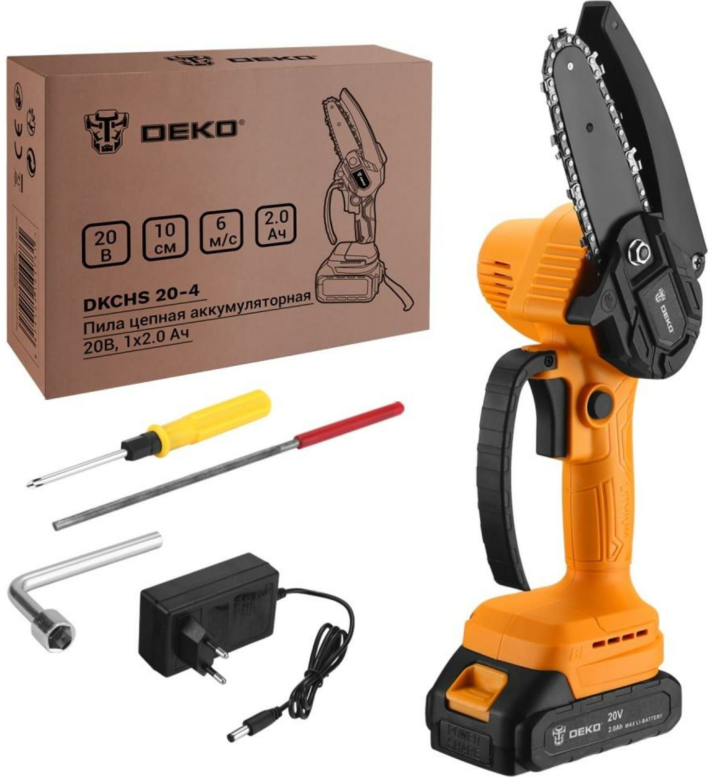 • Комплектация Пила. Шина - 1 шт. Цепь - 1 шт. Зарядное устройство - 1 шт. Аккумулятор 20 В, 2 А*ч - 2 шт. Отвертка - 1 шт. Гаечный ключ - 1 шт. Напильник для заточки цепи - 1 шт. Инструкция. Упаковка