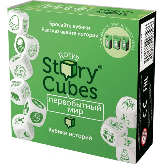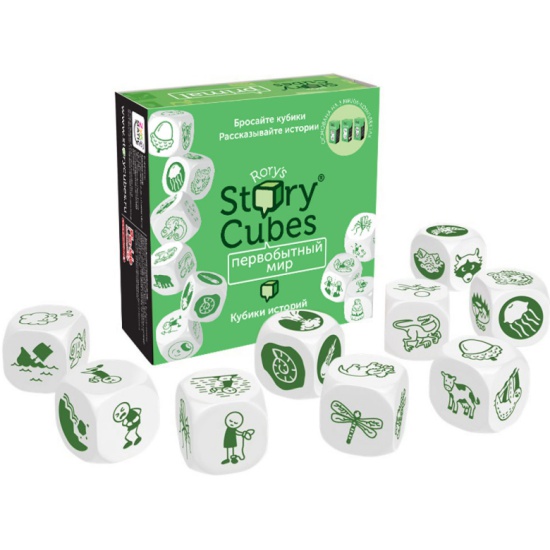 Настольная игра RORYS STORY CUBES Кубики историй Первобытный мирRory’s Story Cubes — совершенно неординарная игра. В небольшой яркой коробочке всего девять шестигранных кубиков. Тем не менее в таком маленьком пространстве умещается бесконечность человеческого воображения. На каждой грани кубика нанесен уникальный рисунок. На первый взгляд рисунки никак не связаны между собой: например, вам может выпасть змея, перфоратор и арахис. Нужно связать эти картинки в сюжете истории. Любыми способами, которые придут вам в голову, используя кубики и коробку.Эта версия игры посвящена первобытному миру. Древние люди, первые кругосветные путешествия, редкие и удивительные животные, динозавры — все то, что окружало первых людей или даже раньше. Великие географические открытия, новые земли, природные явления, которые оказывали влияние на жизнь и развитие наших предков. Набор основан на мини-версиях «Открытия», «Животные» и «Динозавры». 3+3+3=9 кубиков о том, какой Земля была раньше!Эту версию можно объединять с любой другой, добавляя таким образом историям новые акценты. Изображения на кубиках сделаны зелеными специально для того, чтобы различные наборы не перепутались.Как играть:Итак, в наборе девять шестигранников, на стороны которых нанесены 54 неповторяющиеся картинки с разными активностями и действиями. Вам придется их между собой связать. Берите все кубики в руку, хорошенько трясите и бросайте. Картинки, которые выпали должны составлять сюжет вашей истории. Разделите шестигранники на три группы (по три кубика в каждой) и начинайте фантазировать. Первые три кубика — это начало истории, следующие — продолжение, а последняя тройка — концовка.Игра как ни одна другая развивает фантазию и мышление. Даже если в школе писать сочинения для вас было настоящей пыткой, она поможет вам осознать, что, на самом-то деле, вы очень творческая личность!Размер упаковки: 3 × 8 × 7.5 смВес: 0.15 кг.