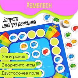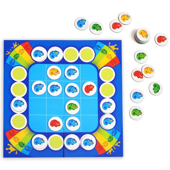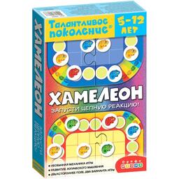 Настольная игра ДРОФА-МЕДИА 4204 Талантливое поколение. ХамелеонВесёлые хамелеоны меняют свой цвет, если их напугать!Стоит испугать одного, как запускается цепная реакция.Вот уже синие хамелеоны стали зелёными, зелёные - жёлтыми, а жёлтые - красными! Запусти цепную реакцию!Чтобы хамелеон сменил цвет, достаточно заменить один жетон на другой - отличная тренировка для маленьких пальчиков.Уникальный движок и милые хамелеончики никого не оставят равнодушным.Жетоны с изображением хамелеонов яркие, глянцевые, из качественного плотного картона (диаметр 2,7 см).Необычная механика игры.Развитие логического мышления, умения предсказывать действия соперника, мелкой моторики.Двустороннее поле, два варианта игры.Подходит для семейного досуга, в качестве подарка, в детский сад, для небольшой компании, детям и взрослым.В комплекте: игровое поле из двух частей, 99 жетонов, правила.Возраст: 5-12.Количество игроков: 2-6.Размер коробки: 15,5х24х3,3 см.