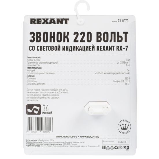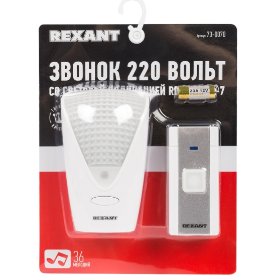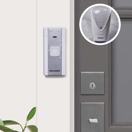 Беспроводной дверной звонок REXANT в розетку 220 В и световой индикацией, 36 мелодийДанная модель идеально подойдет для дома, звонок может быть установлен в любом месте, где есть розетка. Динамик оснащен регулировкой громкости и световым индикатором. Для работы динамик необходимо вставить в розетку 220-230 В.Характеристики:36 мелодий3 уровня регулировки громкости 65-85 дБ (низкий / средний / высокий)дальность действия: 80 метроввлагозащищенность кнопки IP44.Питание:динамик: от розетки 220-230 Вкнопка вызова: от 1 батарейки 23А.Комплектация:кнопка вызова - 1 шт.динамик со световой индикацией - 1 шт.батарейка 23А - 1 шт.