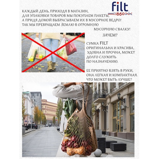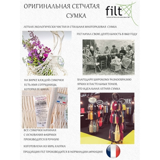Сумка-авоська Filt Fap 40Х40 длинные ручки, Светло-РозовыйВинтажная эко сумочка-авоська FAP производится во Франции, на заводе Filt уже почти 100 лет и является одним из символов "старой Франции".Элегантные, но практичные и экономные француженки ещё с 30х годов 20-го века полюбили эти красивые, удобные и прочные сумки.Многоразовая авоська шопер из хлопка соответствуют имиджу покупателя, предпочитающего здоровые продукты и заботящегося об окружающей среде.Сумочка-авоська FAP производится из высококачественного хлопка, окрашивается нетоксичными красителями.Не выцветает и не теряет форму при стирке и в процессе эксплуатации.Этот шоппер имеет длинные ручки, благодаря которым авоську удобно носить на плече. Размер 40х40 см, длина ручек 25 см.Авоська выдерживает 20 кг.