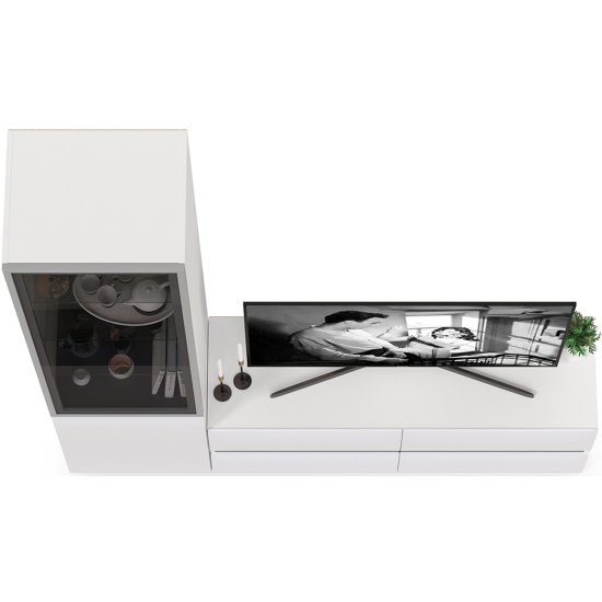 Гостиная MOBI Сидней Комплектация № 09, цвет корпус: белый/чёрный/фасады: МДФ белый глянец, ШхГхВ 179,9х41,3х205,2 см., ниша для ТВ 129х41х100 см., универс. сборкаГостиная Сидней № 9 с фасадами стекло.Цвет - белый/чёрный/фасады МДФ белый глянец.Габариты (ШхГхВ) 179,9х41,3х205,2 см.Ниша для ТВ (ШхГхВ) 129х41х100 см.Состоит из тумбы для ТВ и шкафа с фасадами стекло.Тумба оборудована 4 ящиками на шариковых направляющих.Шкаф разделён на два отделения за распашными дверками - верхнее и нижнее.Верхнее отделение со стеклянной дверкой, за которой располагаются три стеклянные полки.