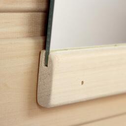 Такое зеркало подойдёт для бани и сауны. Дерево не выделяет вредных веществ при нагревании и подходит для помещений с высокой влажностью.