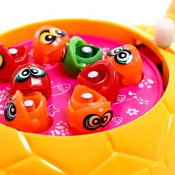 Чтобы начать, заведите игрушку. Фигурки начнут крутиться и перемещаться с места на место. Поймайте рыбку магнитной удочкой и быстро поднимите её вверх, стараясь не упустить добычу.