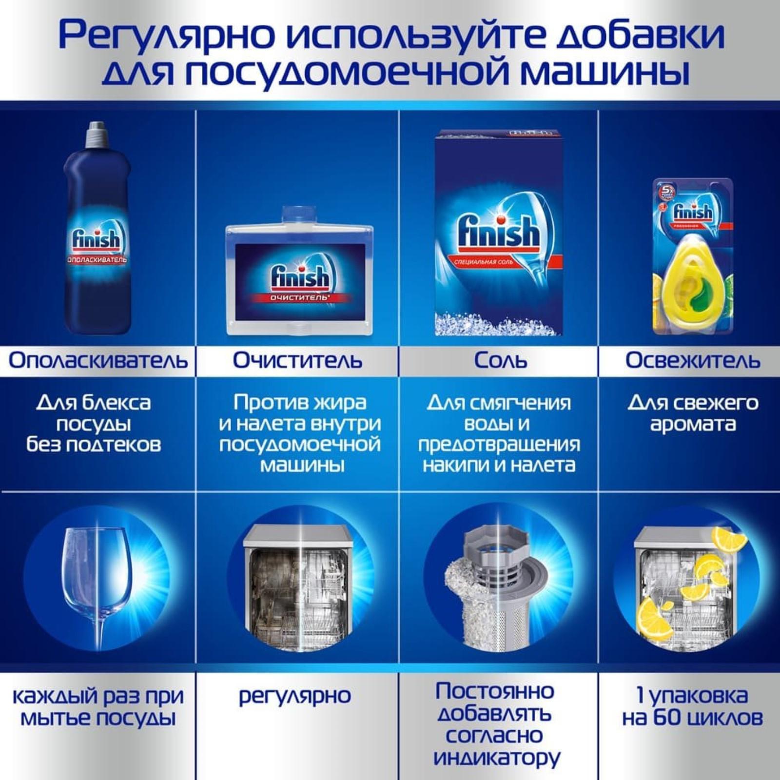 При мытье в посудомоечной машине на посуде могут остаться подтеки и следы от капель воды. Для борьбы с этой проблемой и ускорения процесса сушки рекомендуем добавлять ополаскиватель Finish.