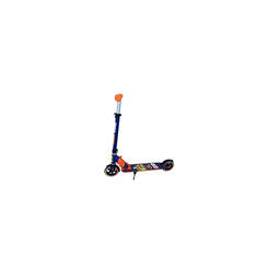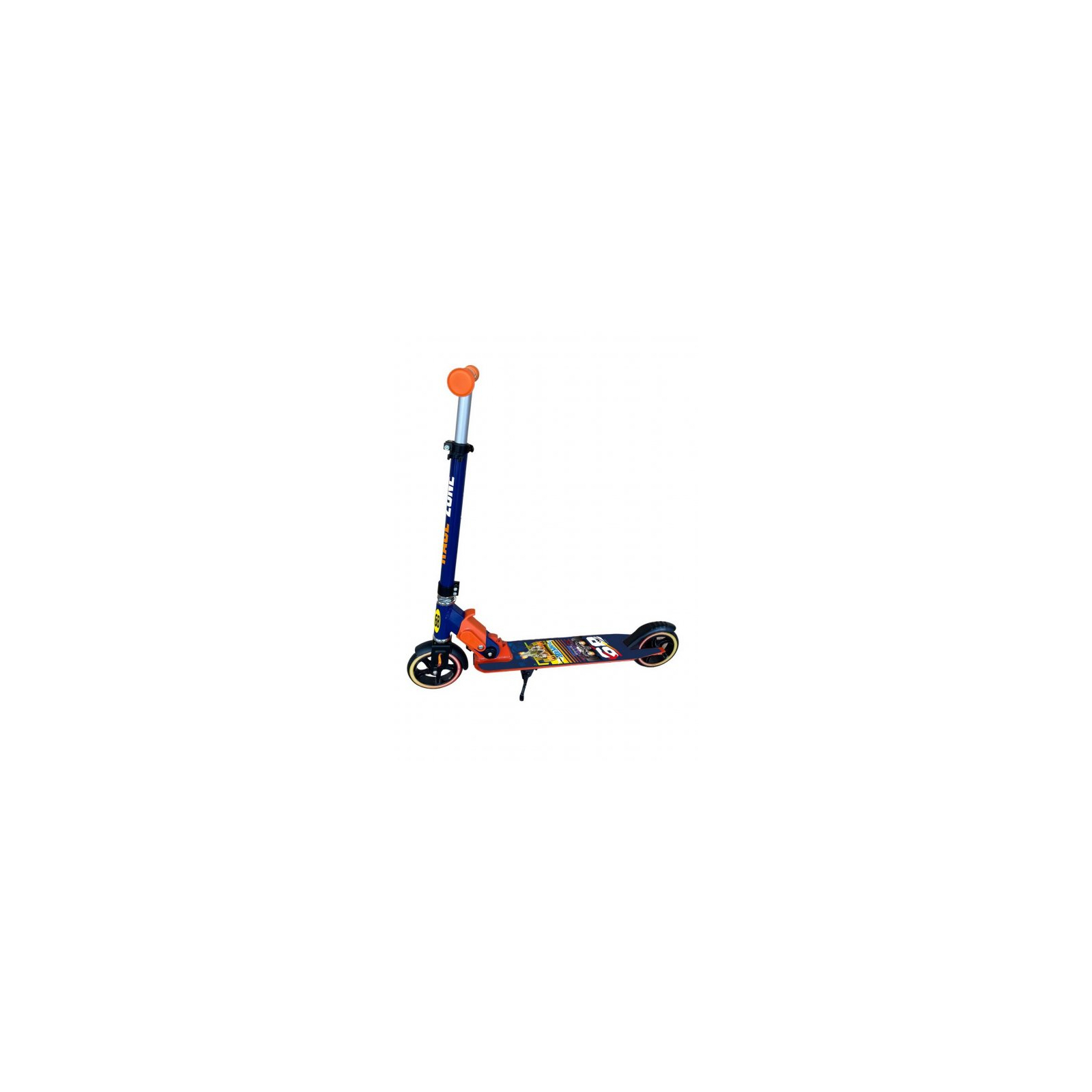Дитячий міський самокат синьо-жовтогарячого кольору та з наклейками Hot Wheels. Складна конструкція. Вбудована підніжка. Ніжні гальма.