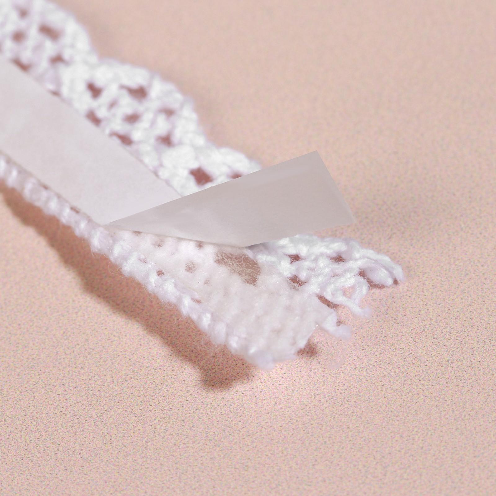 Вязаное кружево легко спутать с hand-made – рисунок у него сложный и выразительный. Если хотите дополнить аксессуар деталью, будто связанной крючком, такой вариант отлично подойдёт. Клеевая основа зафиксирует тесьму на любой декорируемой поверхности.