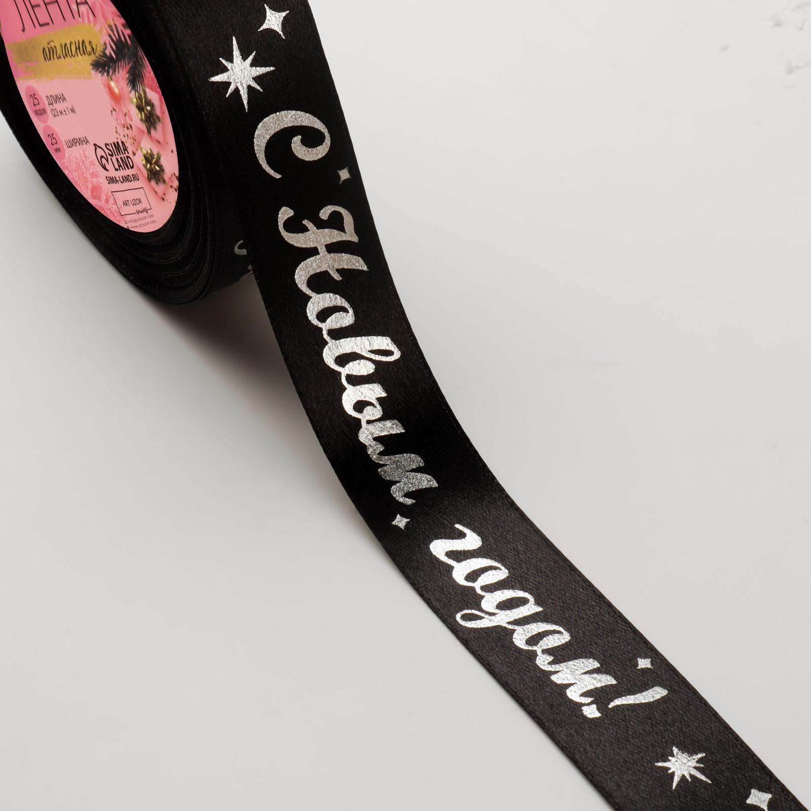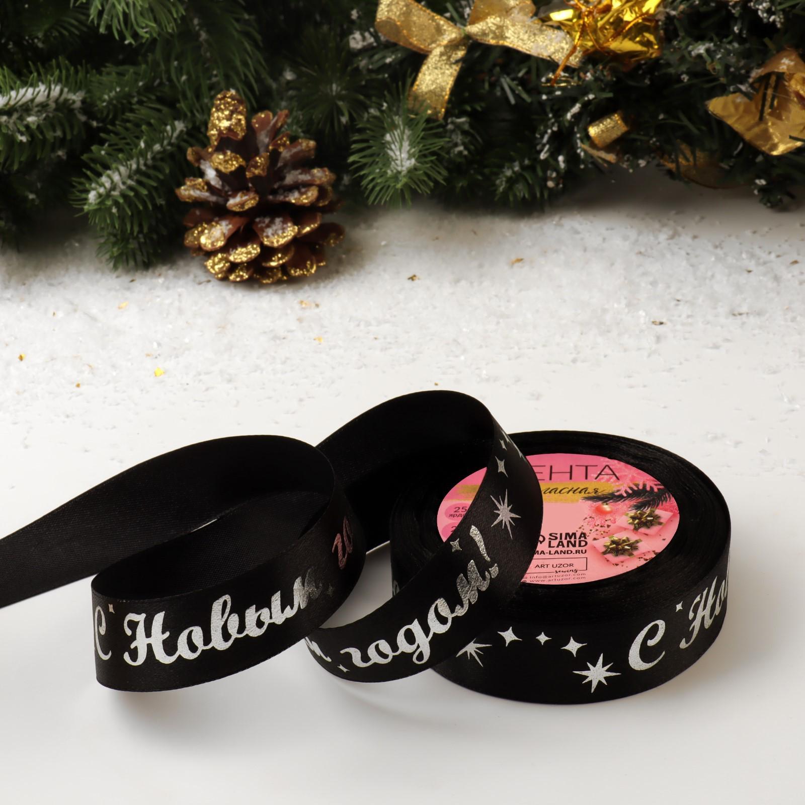 Лента атласная с тиснением «С Новым годом!», 25 мм, 23 ± 1 м, цвет чёрный 7706136