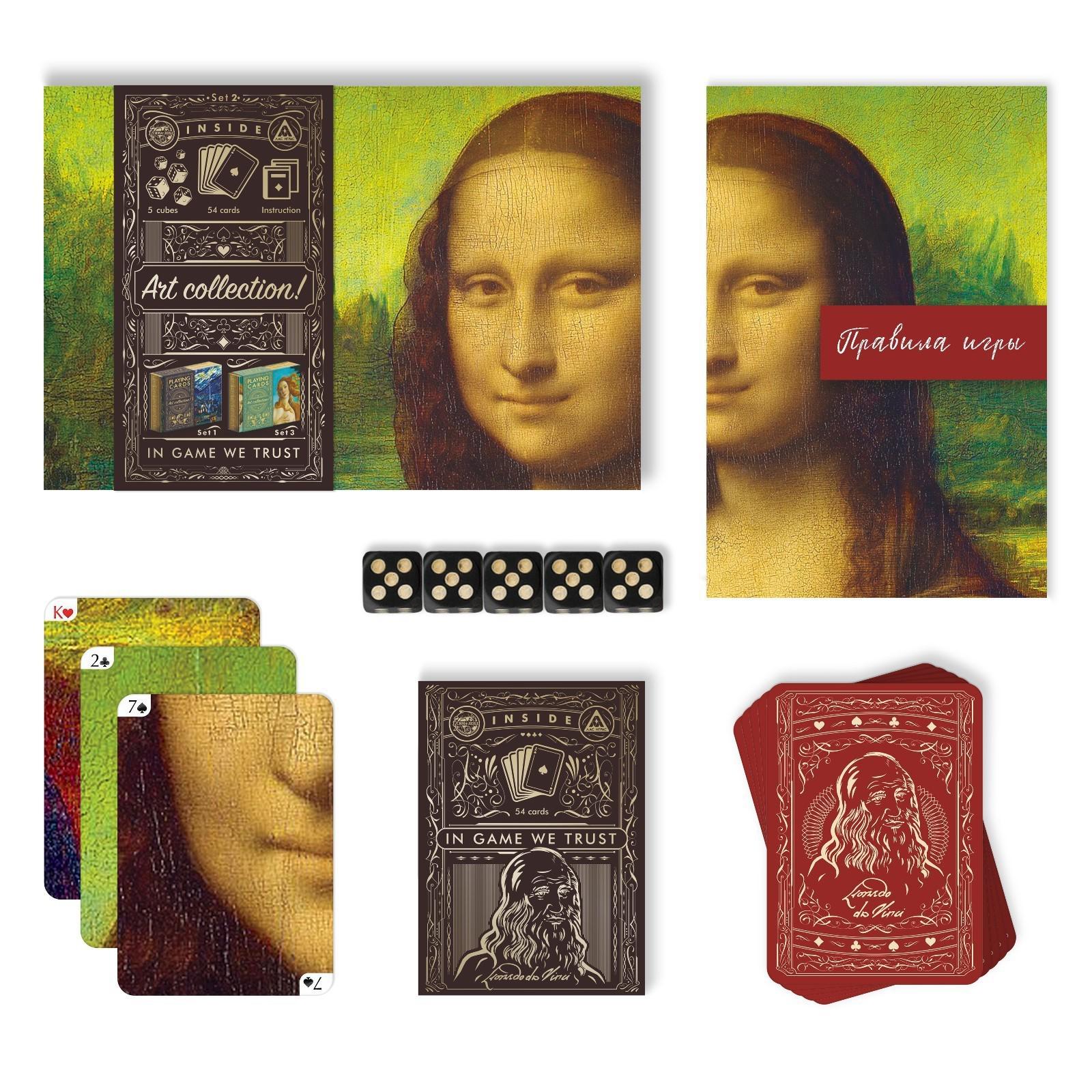 Перед вами премиальный подарочный набор, который включает в себя игральные кости и колоду карт с произведением Леонардо да Винчи «Мона Лиза». Прелесть этой колоды в том, что её можно сложить как пазл и получить цельную картину. В комплекте есть инструкция, в которой описаны варианты карточных игр, а также игр с использованием кубиков.