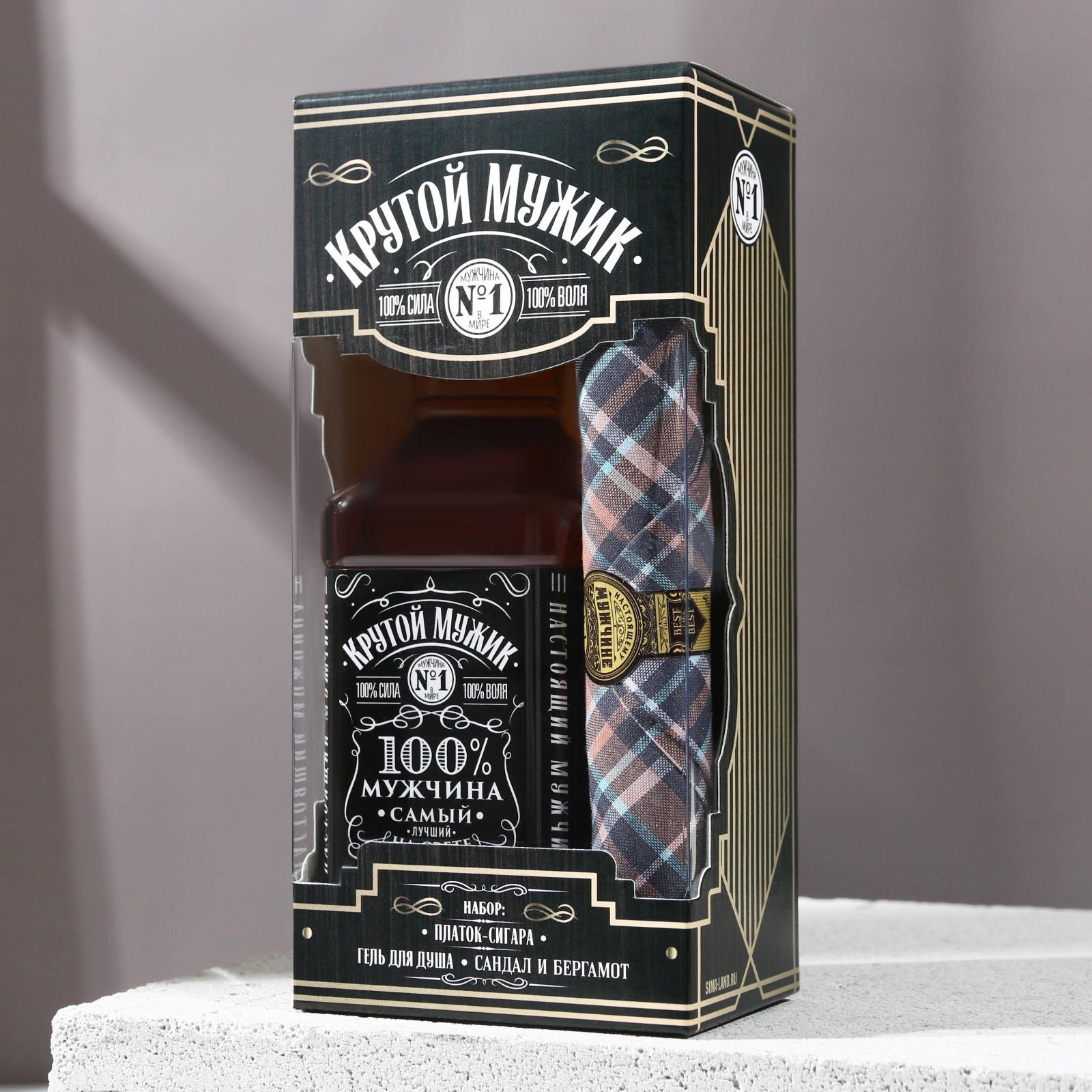 Набор «Крутому мужчине»: гель для душа во флаконе виски 250 мл, аромат сандал и бергамот, платок в форме сигары