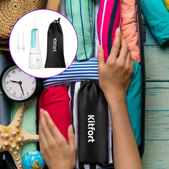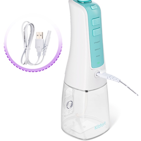Ирригатор Kitfort КТ-2924-3 бело-бирюзовыйИрригатор — это прибор для ухода за полостью рта. Он очень прост в использовании: налейте воду (или специальный раствор для полоскания рта) в резервуар, выберите подходящий вам режим и начинайте очистку.После еды остатки пищи застревают между зубами, забиваются в карманы десен. В таких случаях на помощь может прийти зубная нить или флоссер. Но для чистки зубов нитью необходимо обеспечить чистоту рук, а возможность помыть их имеется далеко не всегда. В противном случае повышается вероятность попадания в полость рта болезнетворных бактерий и вирусов. Также зубной нитью можно механически повредить десны.Ирригатор может частично заменить зубную нить или флоссер. Тонкая и сильная струя воды вымывает остатки еды и налет из межзубного пространства и десневых карманов. Струя воды не только очищает труднодоступные места, но и тщательно массирует десны, что является хорошей профилактикой заболевания десен. Ирригатор считается самым гигиеничным вариантом ухода за полостью рта. Особенно он будет полезен для тех людей, которые носят брекеты, и людям с протезами или коронками.Модель Kitfort KT-2924 является портативным ирригатором, которым можно пользоваться дома, брать с собой в путешествия или на работу — он с легкостью поместится в небольшой сумке.У ирригатора есть резервуар для воды емкостью 300 мл. Этого количества достаточно, чтобы обработать все труднодоступные участки во рту.Моторный блок ирригатора имеет ребристую поверхность, чтобы устройство не скользило в руках.Управление прибором осуществляется через моторный блок портативного ирригатора. На корпусе есть кнопка включения и кнопка выбора режима. У ирригатора 3 режима работы — «Стандарт», «Бережно», «Пульс». Если вы до этого не пользовались ирригатором, начните с режима «Бережно», т.к. неподготовленные и чувствительные десны могут начать кровоточить из-за сильного и тонкого потока воды. Когда десны привыкнут и окрепнут, вы можете переходить на режим «Стандарт», а затем на режим «Пульс».Прибор автоматически отключается после 2 минут использования.В комплекте к ирригатору идут 2 насадки.Заряжать прибор с помощью USB-шнура можно от компьютера или через сетевой адаптер, который наверняка окажется у вас дома.С профилактическими целями ирригатор нужен каждому взрослому человеку. Ирригатор не заменяет собой зубную щетку, он является частью комплексного ухода за полостью рта. Комплексный уход для вас должен подобрать ваш лечащий врач-стоматолог. Обычно уход включает в себя: ирригацию, чистку зубов зубной щеткой и ершиками, полоскание рта ополаскивателем и использование зубной нити, если это необходимо. Этот прибор рекомендуют стоматологи во всем мире.