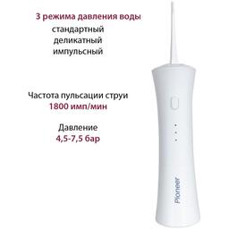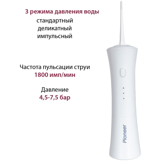 Ирригатор PIONEER HOME Pioneer TI-1008Компактный ирригатор Pioneer идеально подходит для чистки виниров, имплантов, протезов, брекет-систем и мостов. Удаляет бактерии, налет и остатки пищи даже из самых труднодоступных мест между зубами и деснами/.Индикация режимов1. Индикатор стандартного режима2. Индикатор деликатного режима3. Индикатор импульсного режимаФункция запоминания режима.2 стандартные струйные насадкиВходное напряжение: 5 В, 1 АЕмкость батареи: 1800 мАчДавление: 4,5-7,5 барЧастота пульсации струи 1800 имп./минUSB-кабель для зарядки батареиВремя заряда батареи 4-6 часовОбъем резервуара: 150 млМощность: 5 ВтАвтовыключение через 90 сек.Идеально подходит для чистки виниров, имплантов, протезов, брекет-систем и мостов.Удаляет бактерии, налет и остатки пищи даже из самых труднодоступных мест между зубами и деснами.Компактный ирригатор