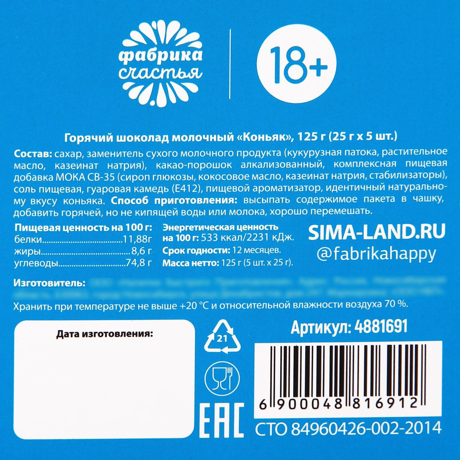 Горячий Шоколад молочный «Жидкость для снятия стресса»: с вкусом коньяка, 25 г. × 5 шт. 4881691