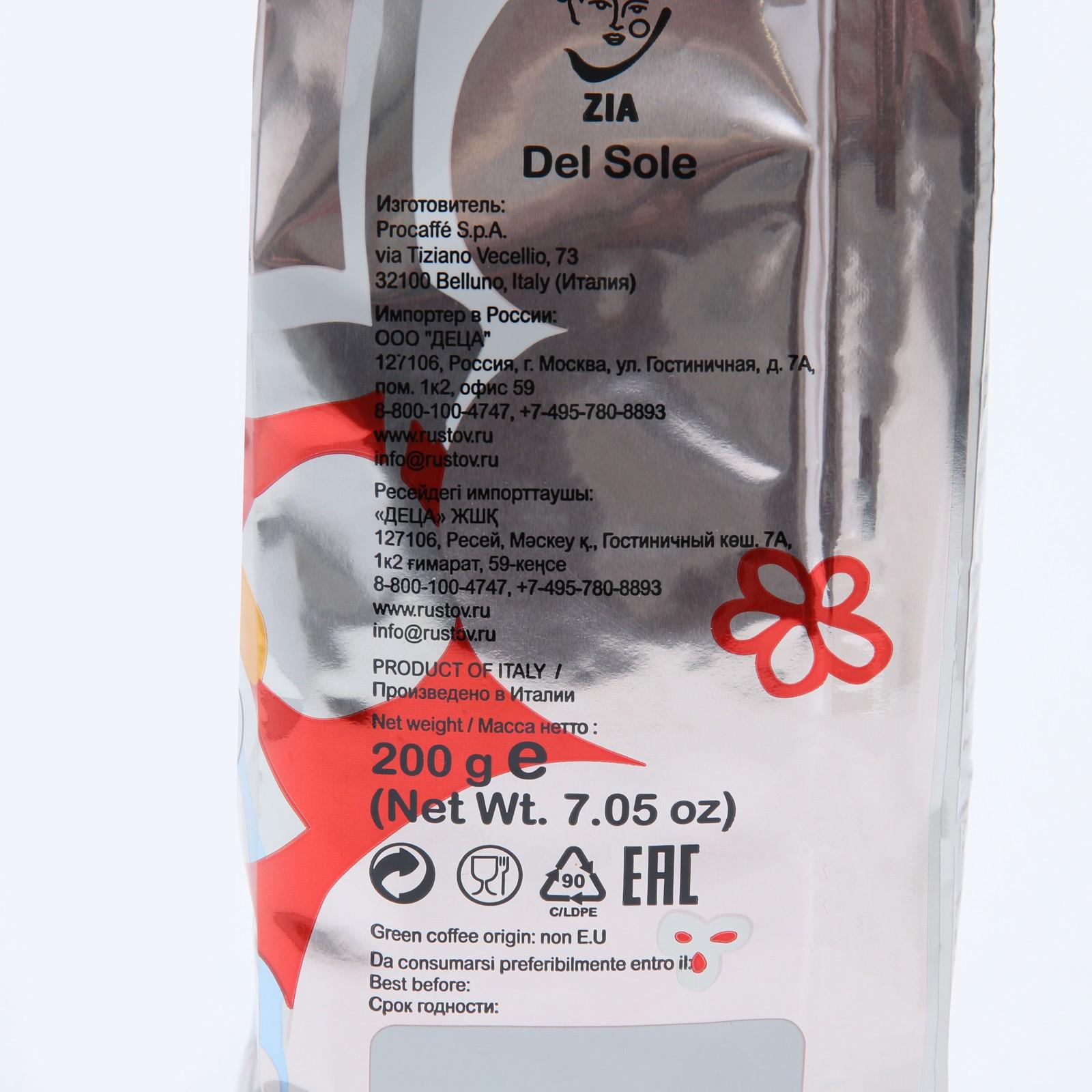Кофе ZIA Del Sole, в зернах, упаковка 200 г 7729864
