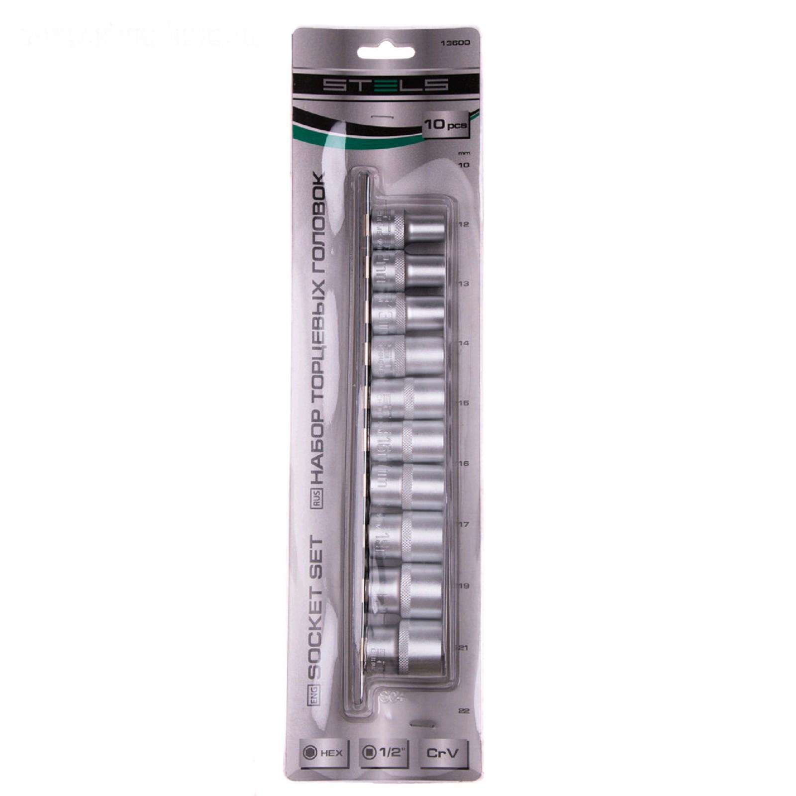 Набор торцевых головок STELS 13600, 1/2", шестигранные, CrV, 10-22 мм, 10 шт.