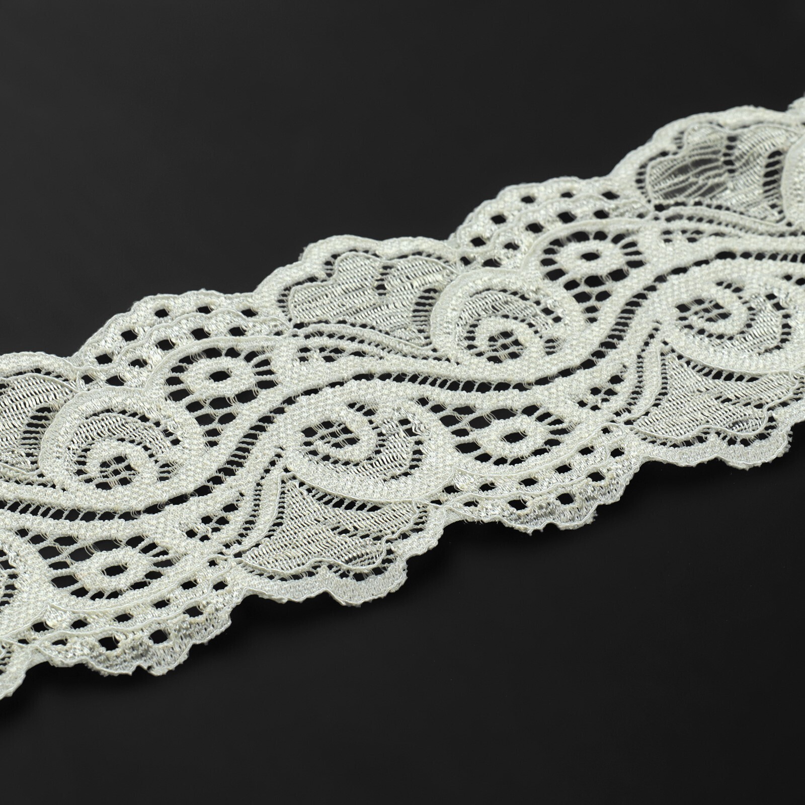 Эластичное кружевное полотно не имеет тканной основы. Благодаря своей пластичности кружево тянется, а переплетения нитей формируют воздушную выразительность.