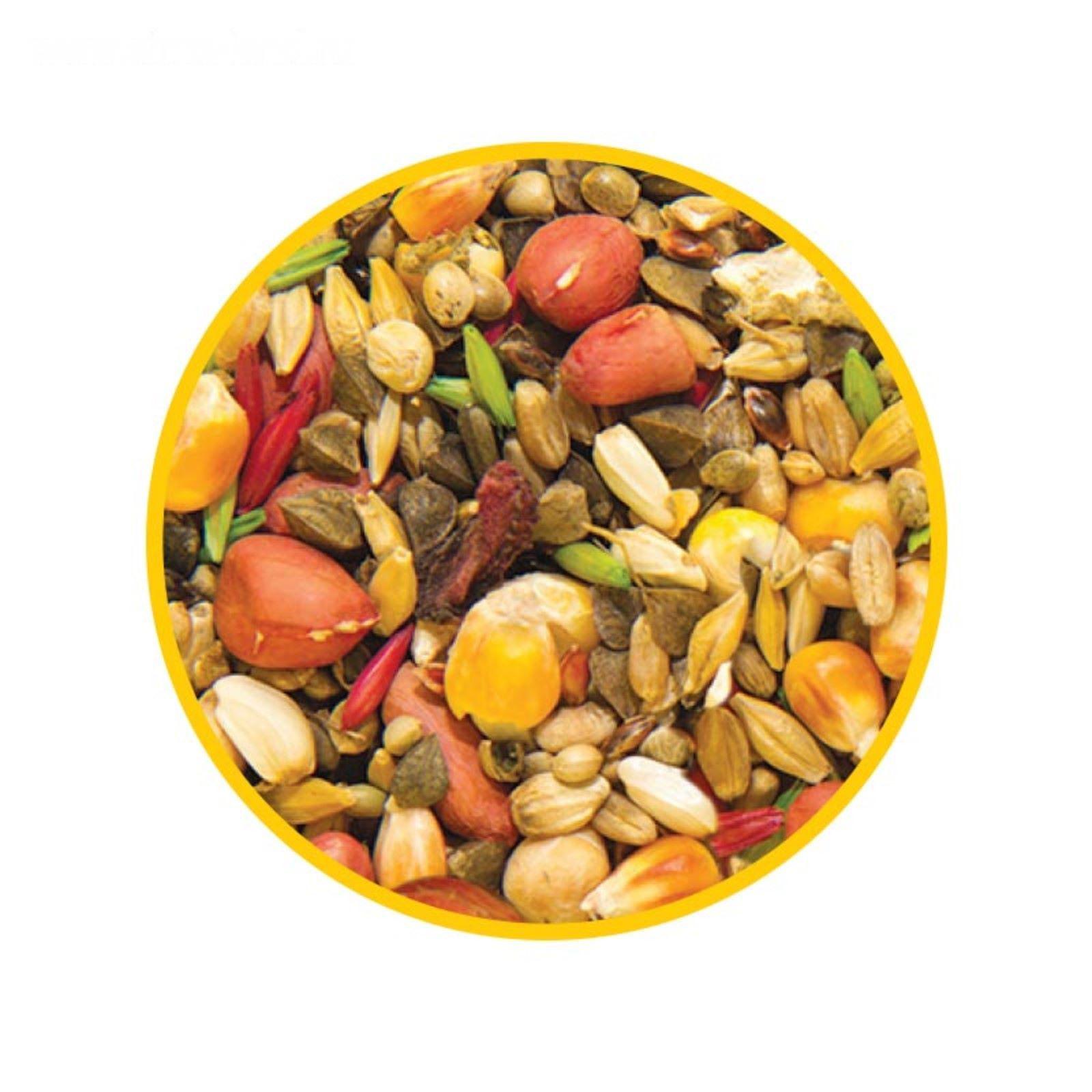 СОСТАВ: Просо красное, просо белое, овес, гречка, ячмень, канареечник, конопля, суданка, семена подсолнечника, сорго, сафлор, морковь, шиповник, кукуруза, горох, арахис, воздушная кукуруза, свекла, витаминный комплекс.