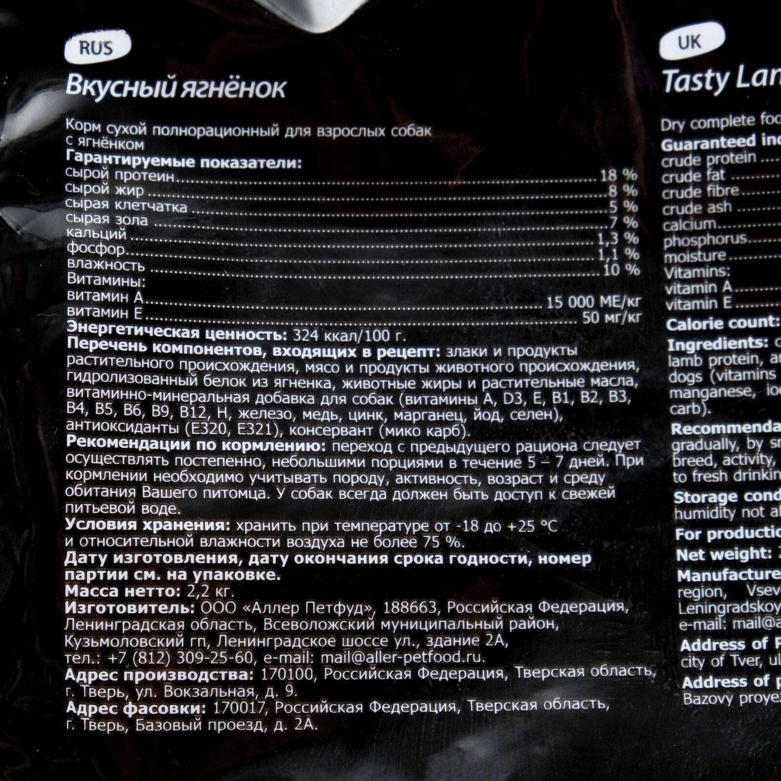 Состав: злаки и продукты растительного происхождения, мясо и продукты животного происхождения, гидролизованный белок из ягненка, животные жиры и растительные масла, витаминно-минеральная добавка для собак (витамины А, D3, E, B1, B2, B3, B4, B5, B6, B9, B12, H, железо, медь, цинк, марганец, йод, селен), антиоксиданты (Е320, Е321), консервант (мико карб).