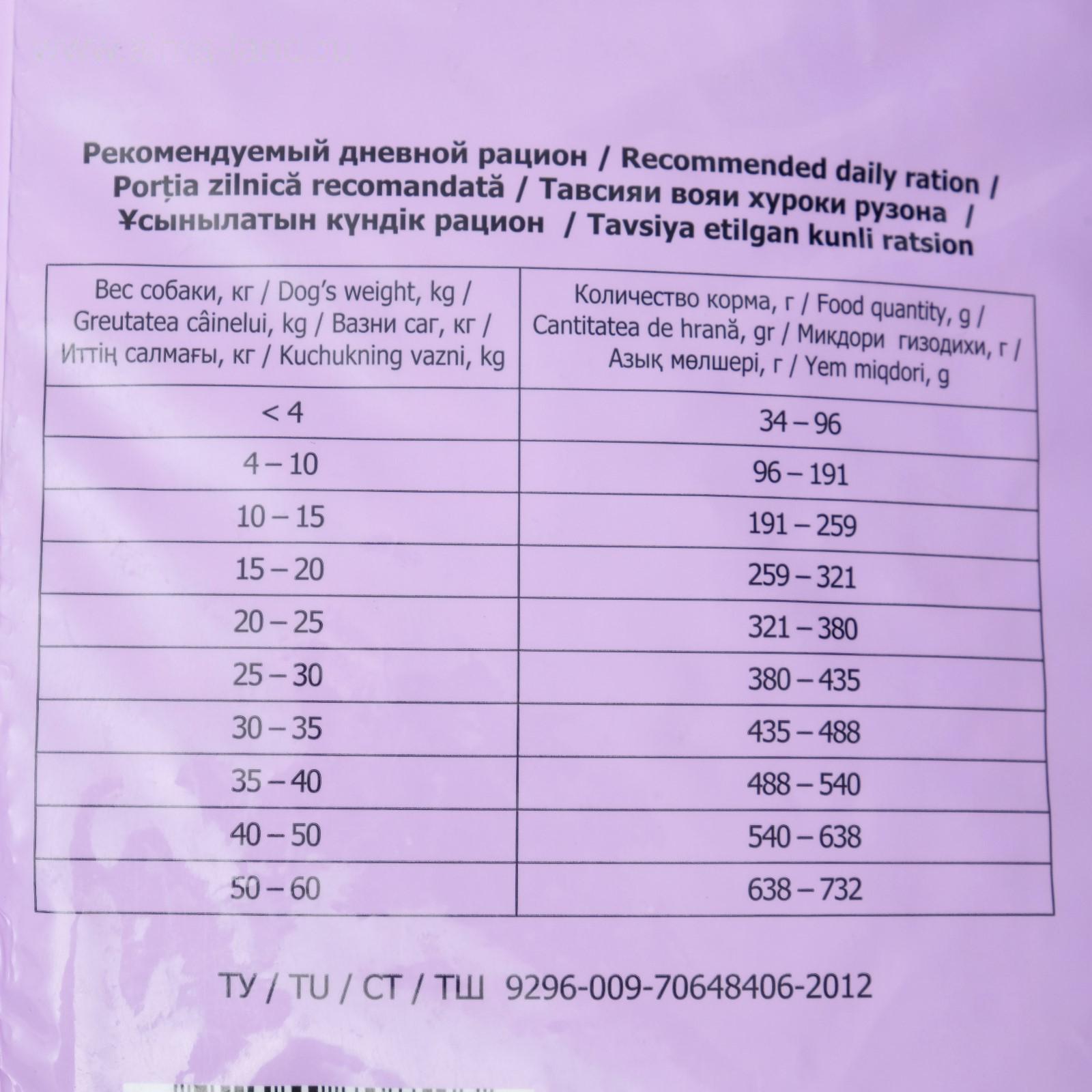 Состав: злаки и продукты растительного происхождения, мясо и продукты животного происхождения, гидролизованный белок из ягненка, животные жиры и растительные масла, витаминно-минеральная добавка для собак (витамины А, D3, E, B1, B2, B3, B4, B5, B6, B9, B12, H, железо, медь, цинк, марганец, йод, селен), антиоксиданты (Е320, Е321), консервант (мико карб).