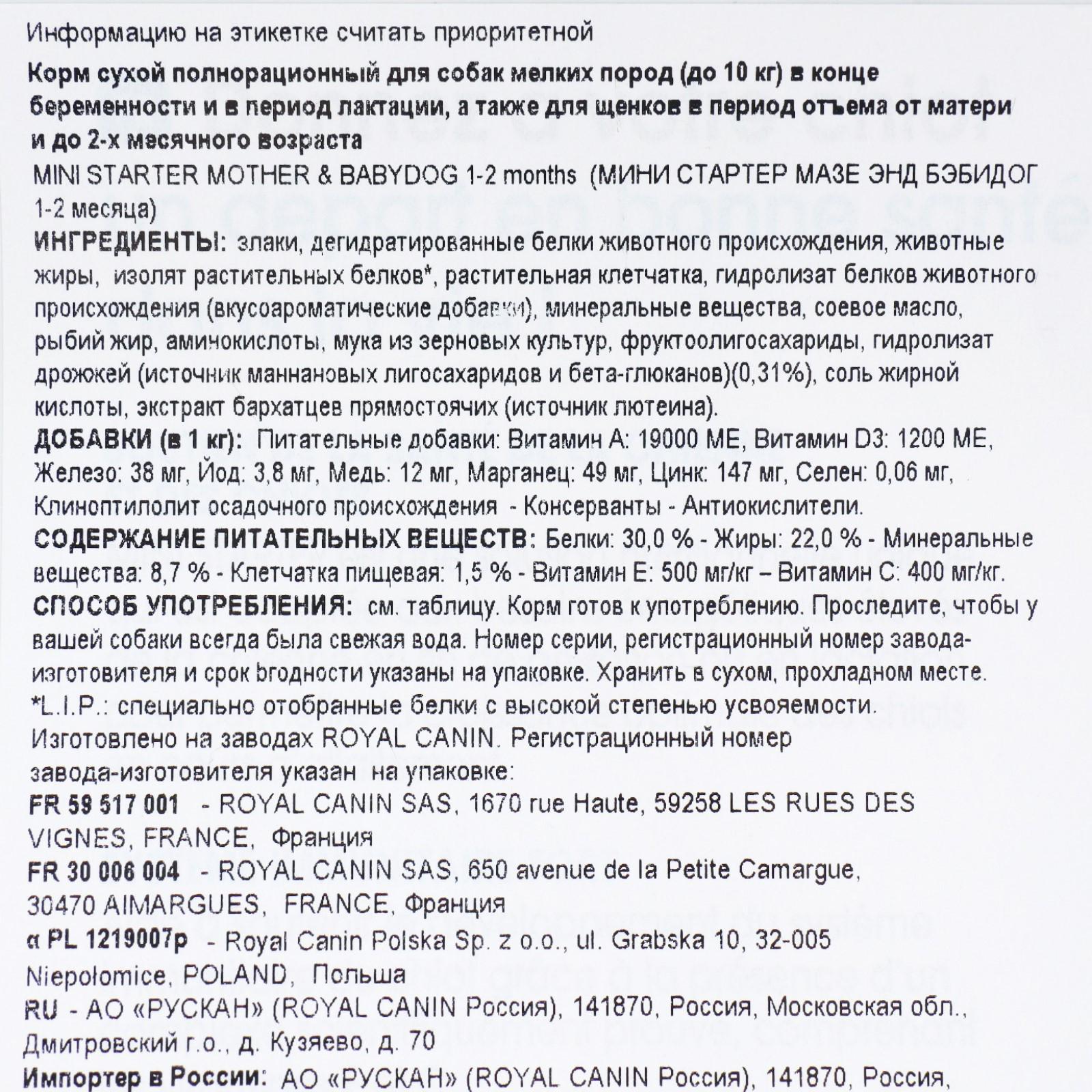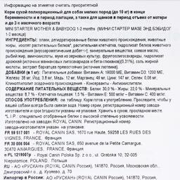 Корм сухой полнорационный для собак мелких размеров (весом до 10 кг) в конце беременности и в период лактации, а также для щенков в период отъема от матери и до 2-х месячного возраста Mini Starter Mother&Babydog.
