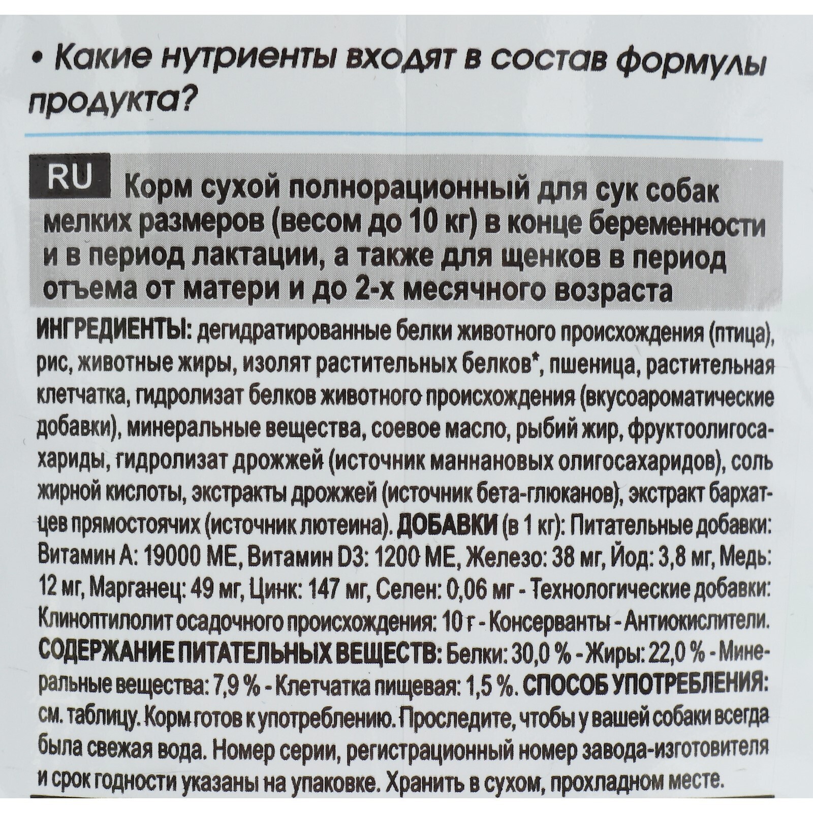 Состав: дегидратированные белки животного происхождения (птица), рис, животные жиры, изолят растительных белков*, пшеница, растительная клетчатка, гидролизат белков животного происхождения (вкусоароматические добавки), минеральные вещества, соевое масло, рыбий жир, фруктоолигосахариды, гидролизат дрожжей (источник мaннановых олигосахаридов), соль жирной кислоты, экстракты дрожжей (источник бета-глюканов), экстракт бархатцев прямостоячих (источник лютеина).