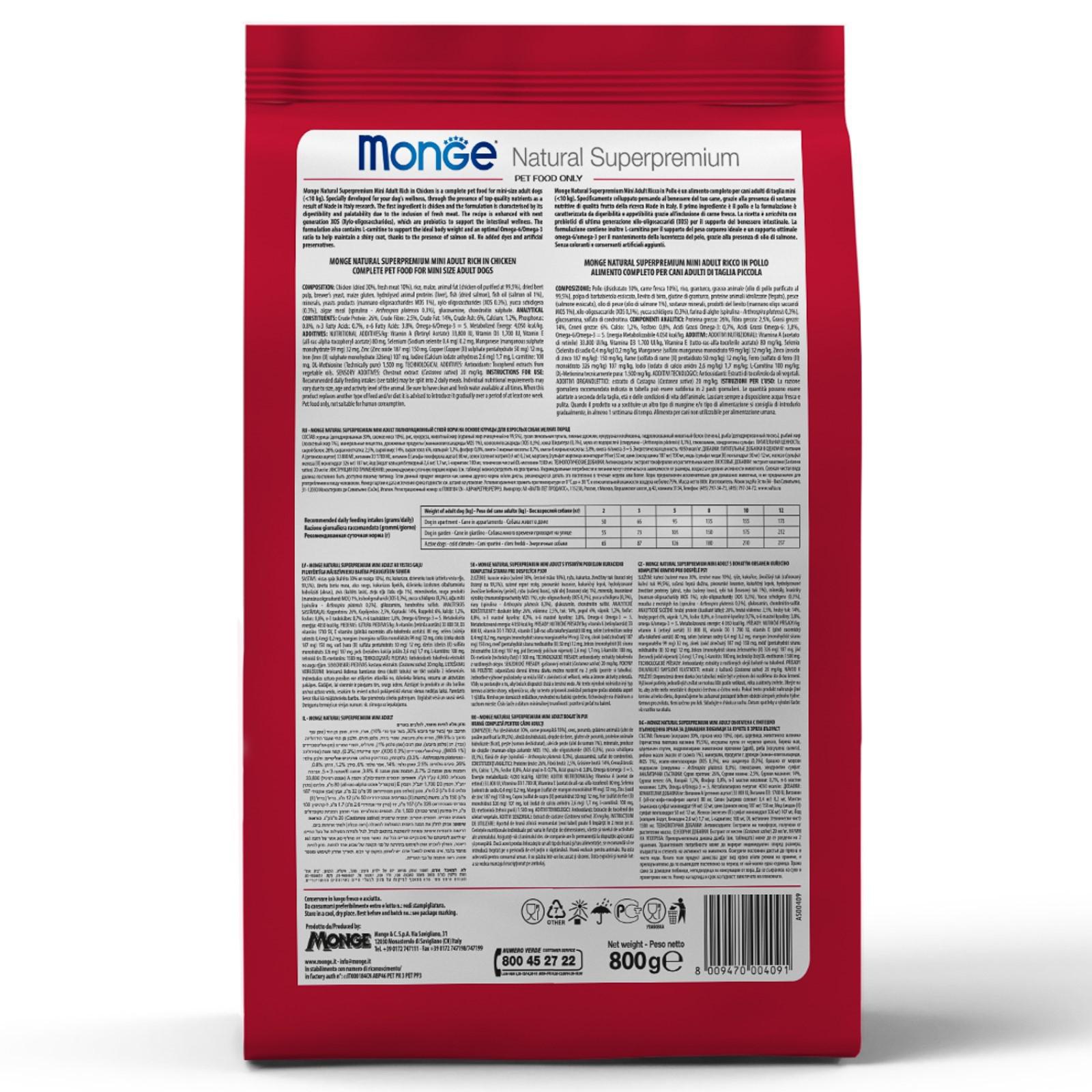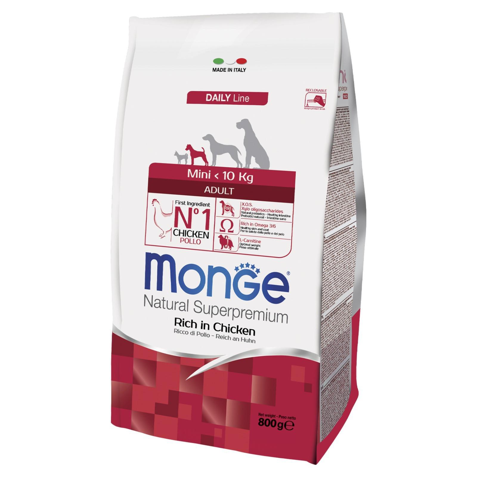 Monge Dog Mini — полнорационный корм на основе мяса курицы и риса для собак. Специально разработан для ежедневного кормления взрослых питомцев мелких пород с нормальной физической активностью.