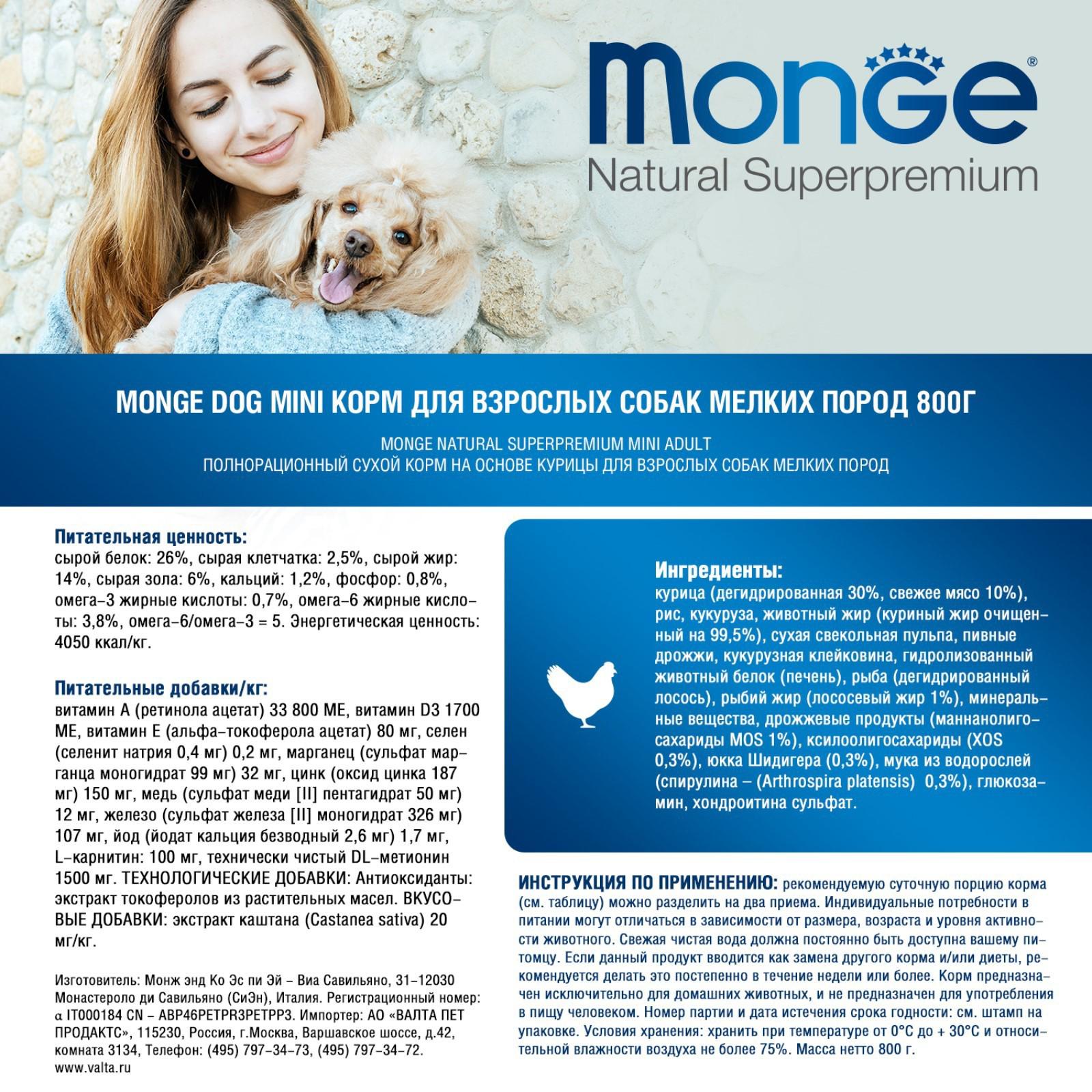 Сухой корм Monge Dog Mini для взрослых собак мелких пород, 800 г.
