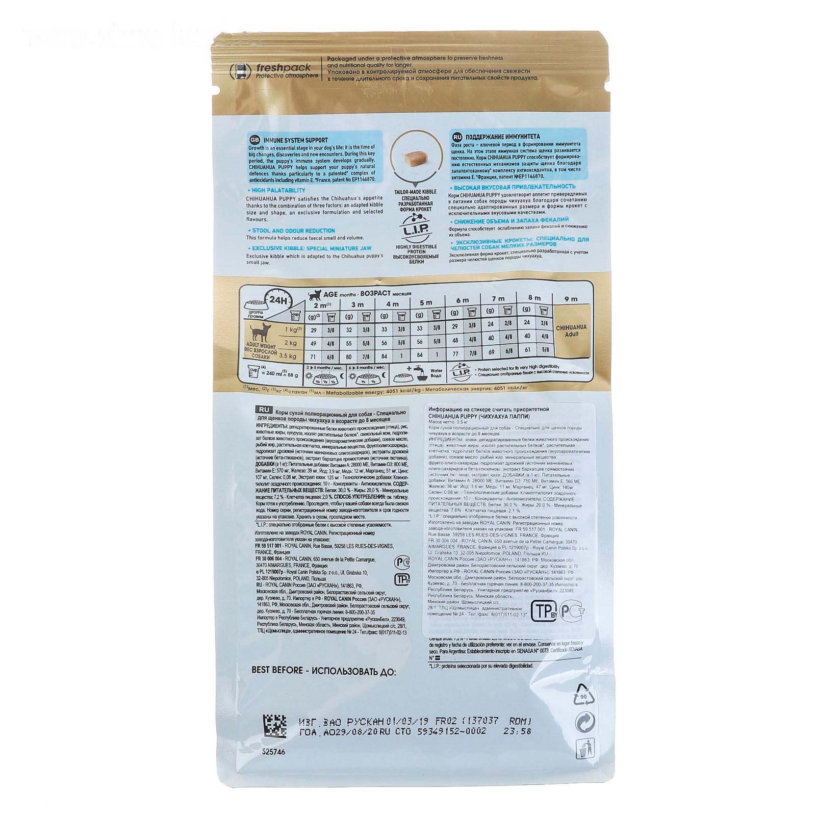 Рацион ROYAL CANIN® Chihuahua Puppy учитывает особые потребности здоровых щенков этой породы и способствует: поддержанию иммунной системы ; поддержанию высокой вкусовой привлекательности продукта; снижению объема и запаха фекалий; 100% полнорационное и сбалансированное питание.