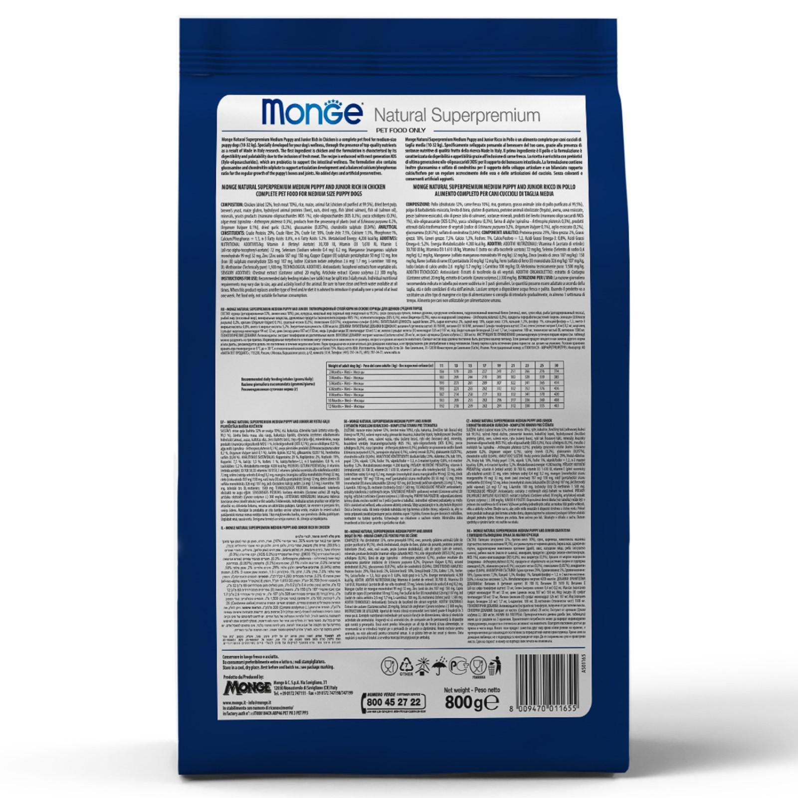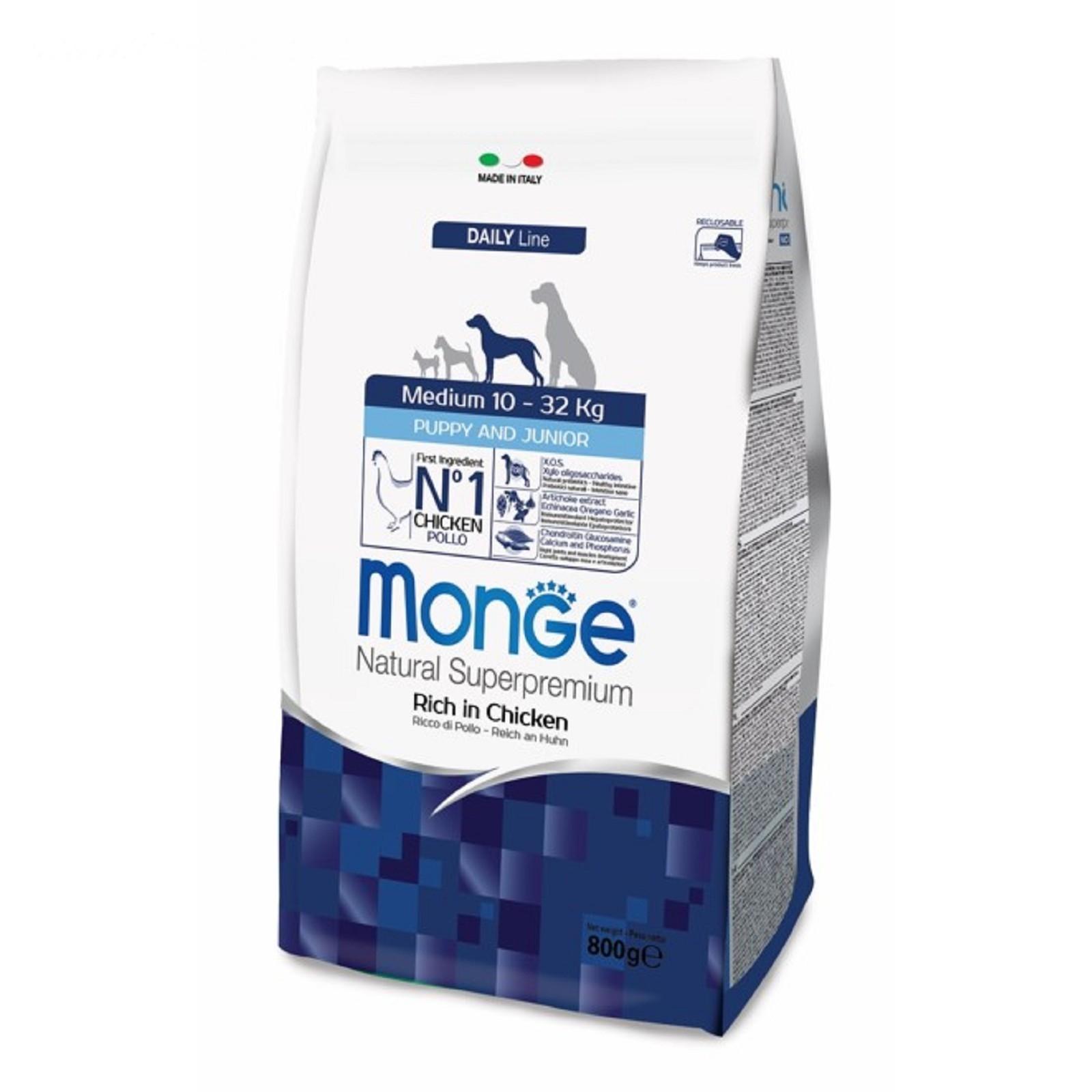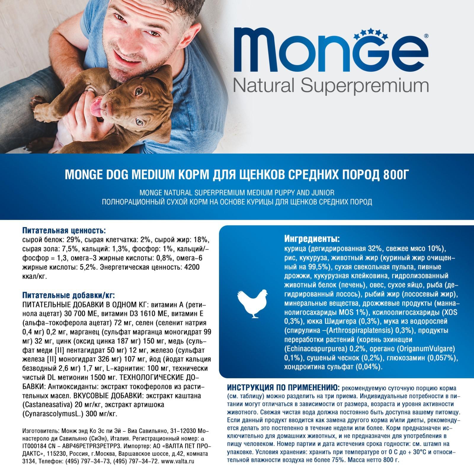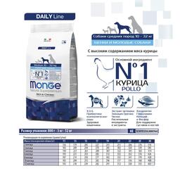 Monge Dog Medium — полнорационный корм на основе мяса цыплёнка и риса для собак. Рекомендуется для щенков и молодых питомцев средних размеров возрастом до 12 месяцев, а также для беременных и кормящих самок.