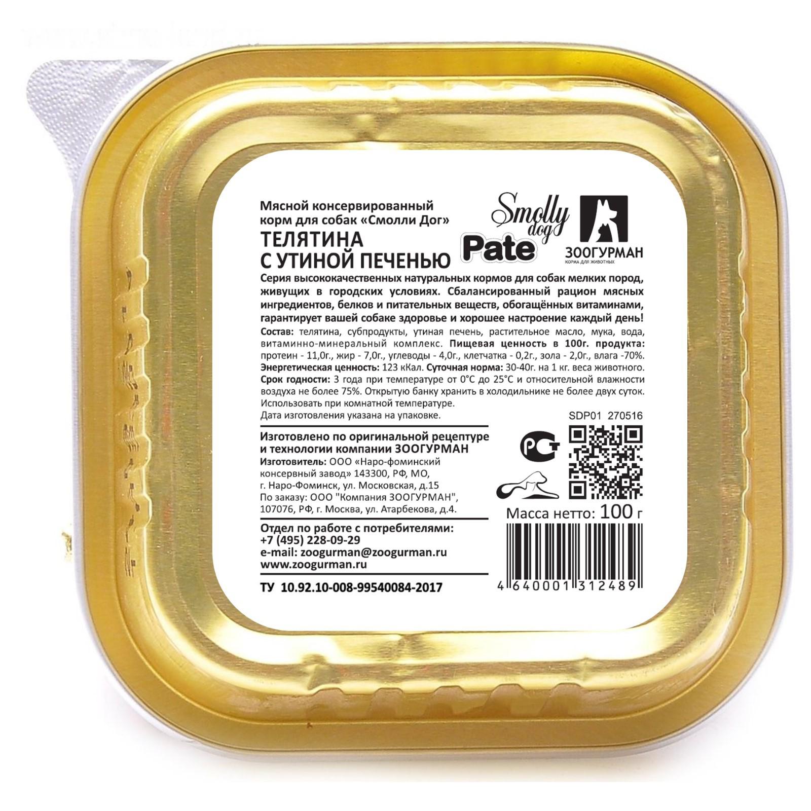Влажный корм "Зоогурман" Смолли Дог для собак, патэ телятина/утиная печень, ламистер, 100г