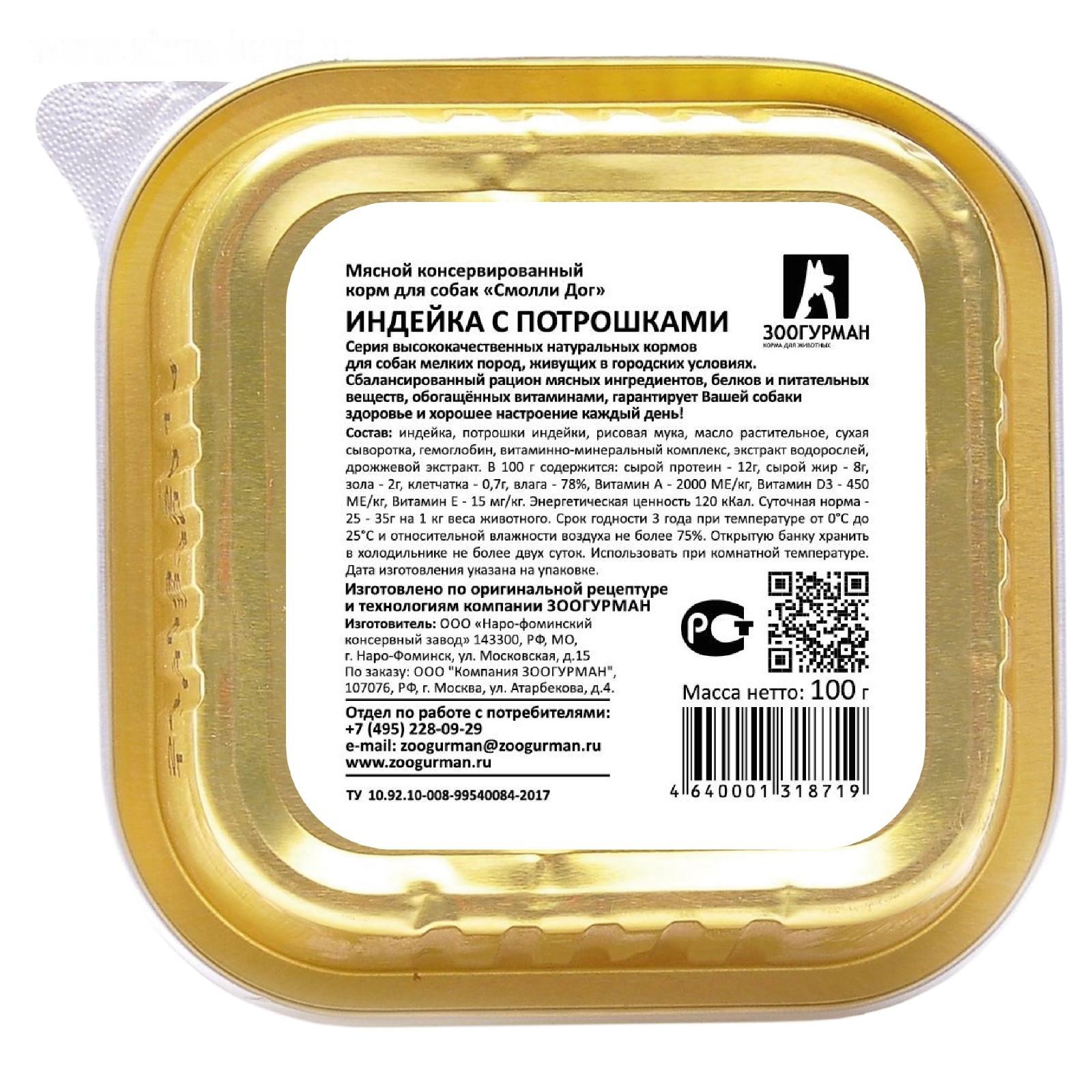 Влажный корм "Зоогурман" Смолли Дог для собак, индейка/потрошки, ламистер, 100 г