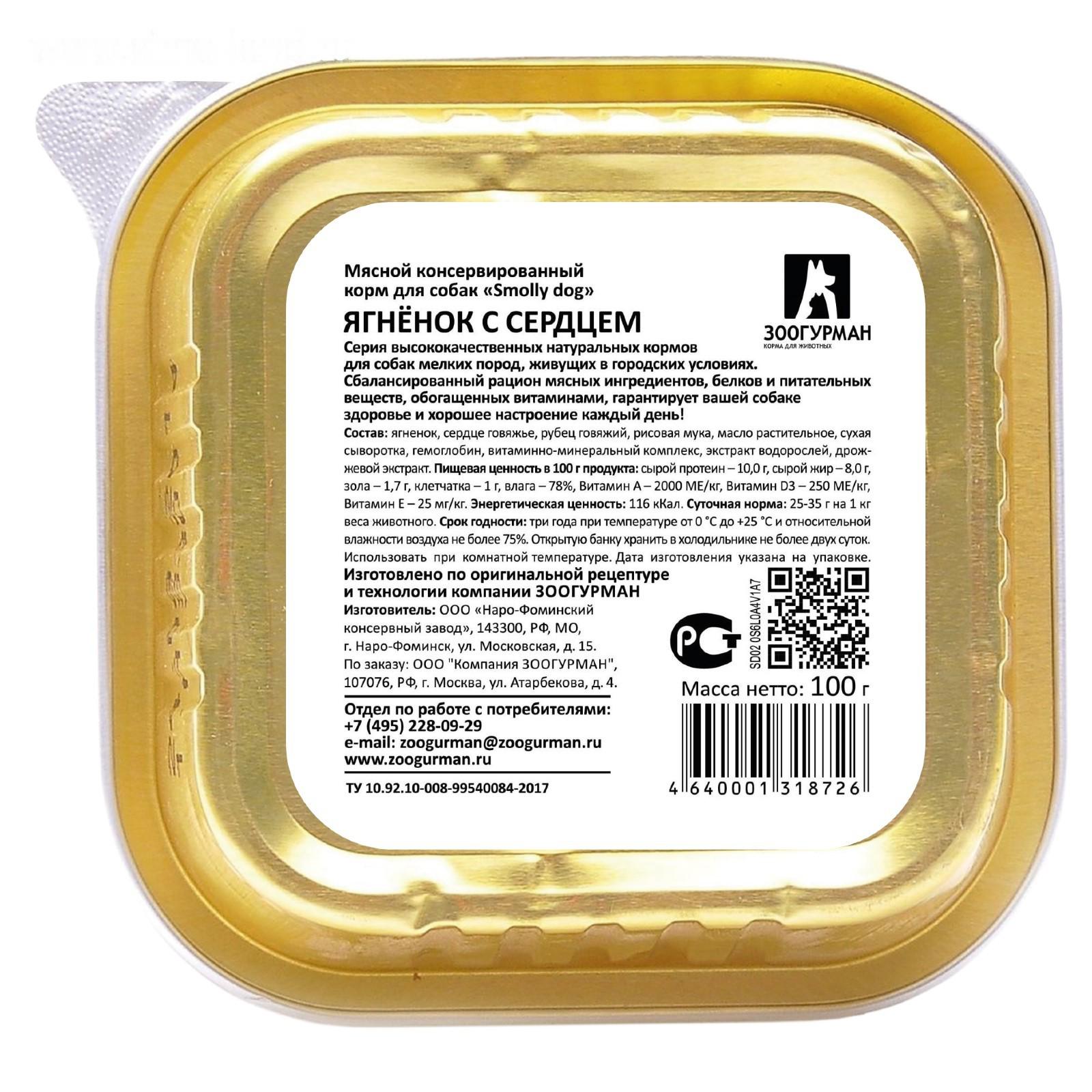 Влажный корм "Зоогурман" Смолли Дог для собак мелких пород, ягнёнок/сердце, ламистер, 100г