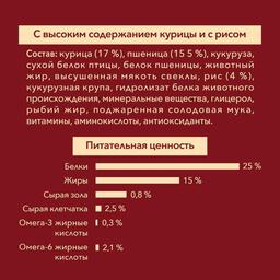 Состав товара: курица (17%), пшеница (15.5%), кукуруза, сухой белок птицы, белок пшеницы, животный жир, высушенная мякоть свеклы, рис (4%), кукурузная крупа, гидролизат белка животного происхождения, минеральные вещества, глицерол, рыбий жир, поджаренная солодовая мука, витамины, аминокислоты, антиоксиданты.