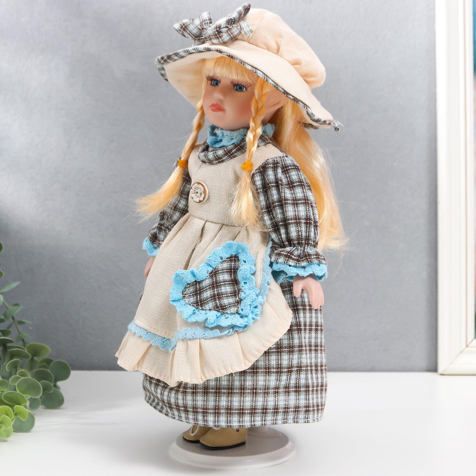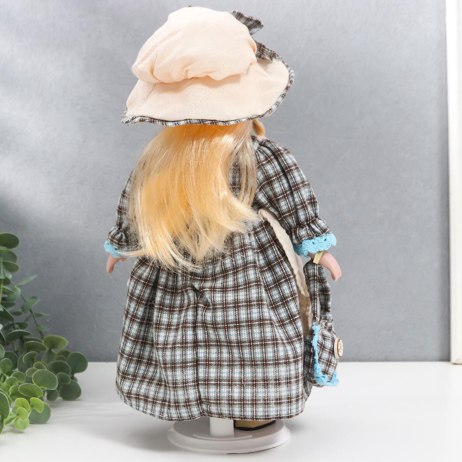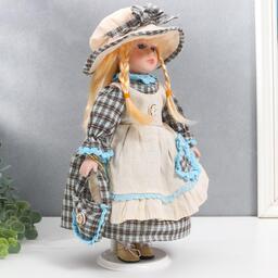 Кукла коллекционная керамика "Лена в голубом платье и шляпке в клетку" 30 см