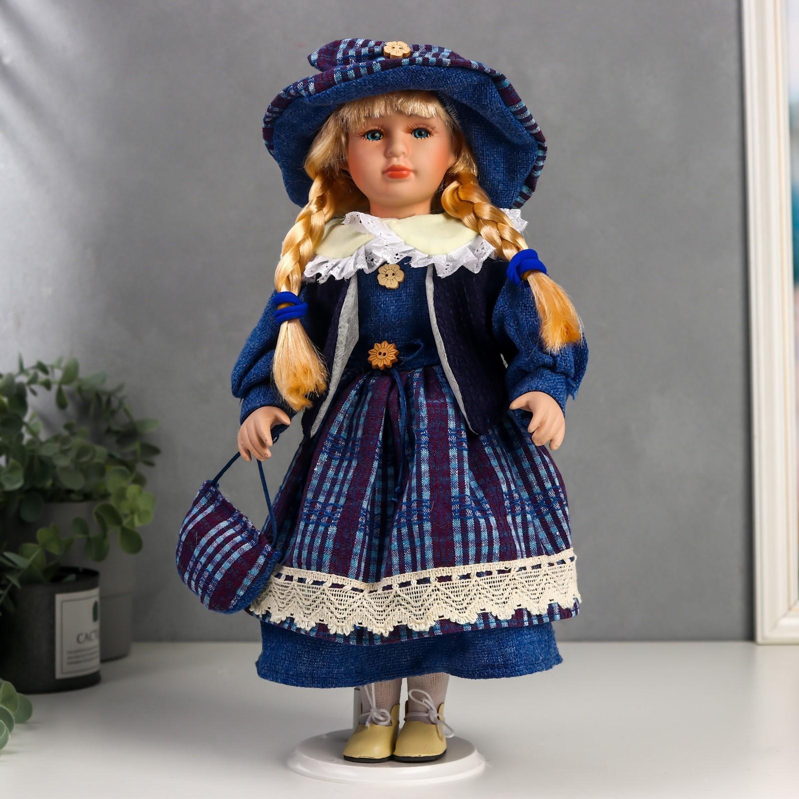 Кукла коллекционная керамика "Сашенька в ярко-синем наряде в клетку" 40 см