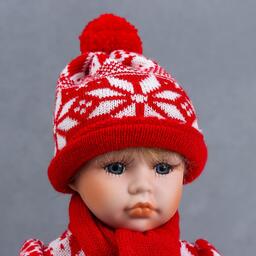 Кукла коллекционная керамика "Паша в красном зимнем свитере, шапке и шарфе" 30 см