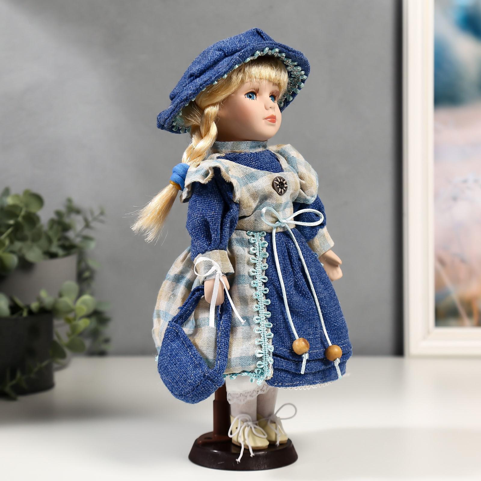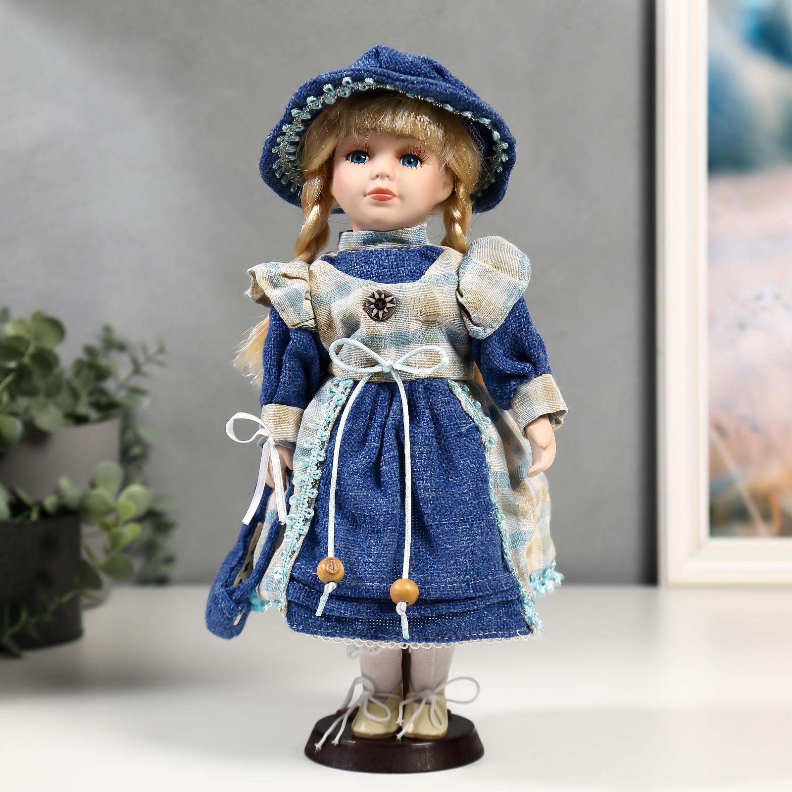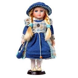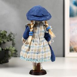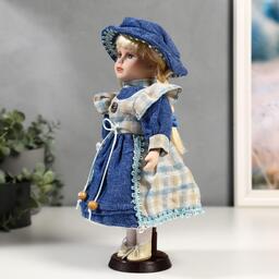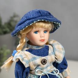 Кукла коллекционная керамика "Алиса в джинсовом платье с клетчатой накидкой" 30 см