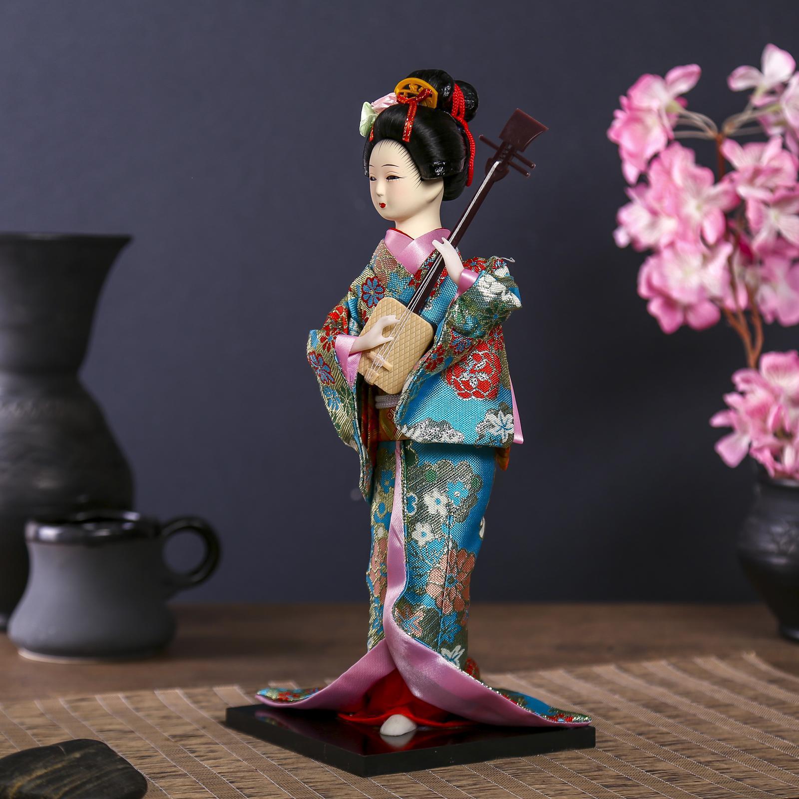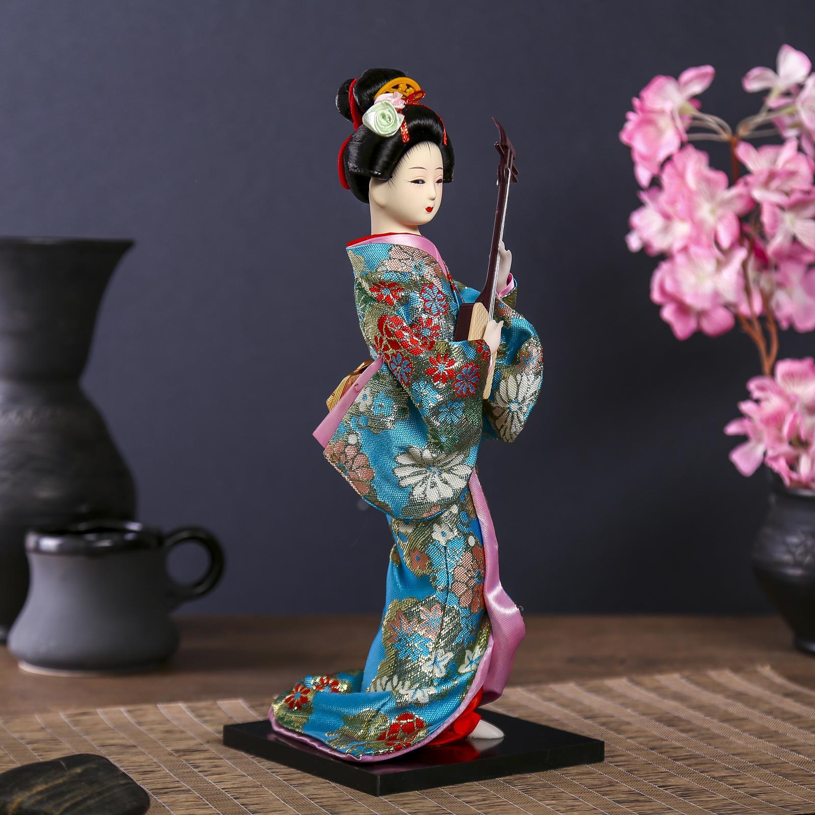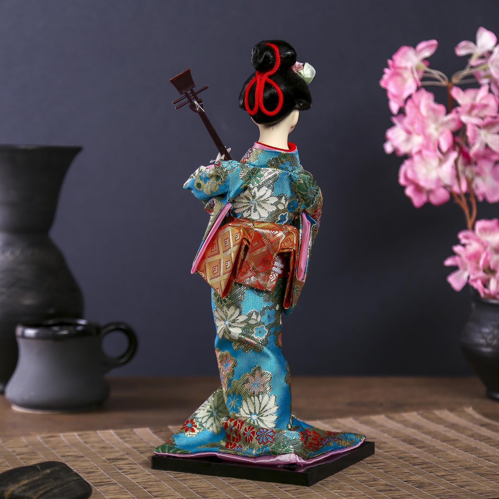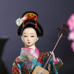 Кукла коллекционная "Гейша в цветочном кимоно с музыкальным инструментом" 30 см