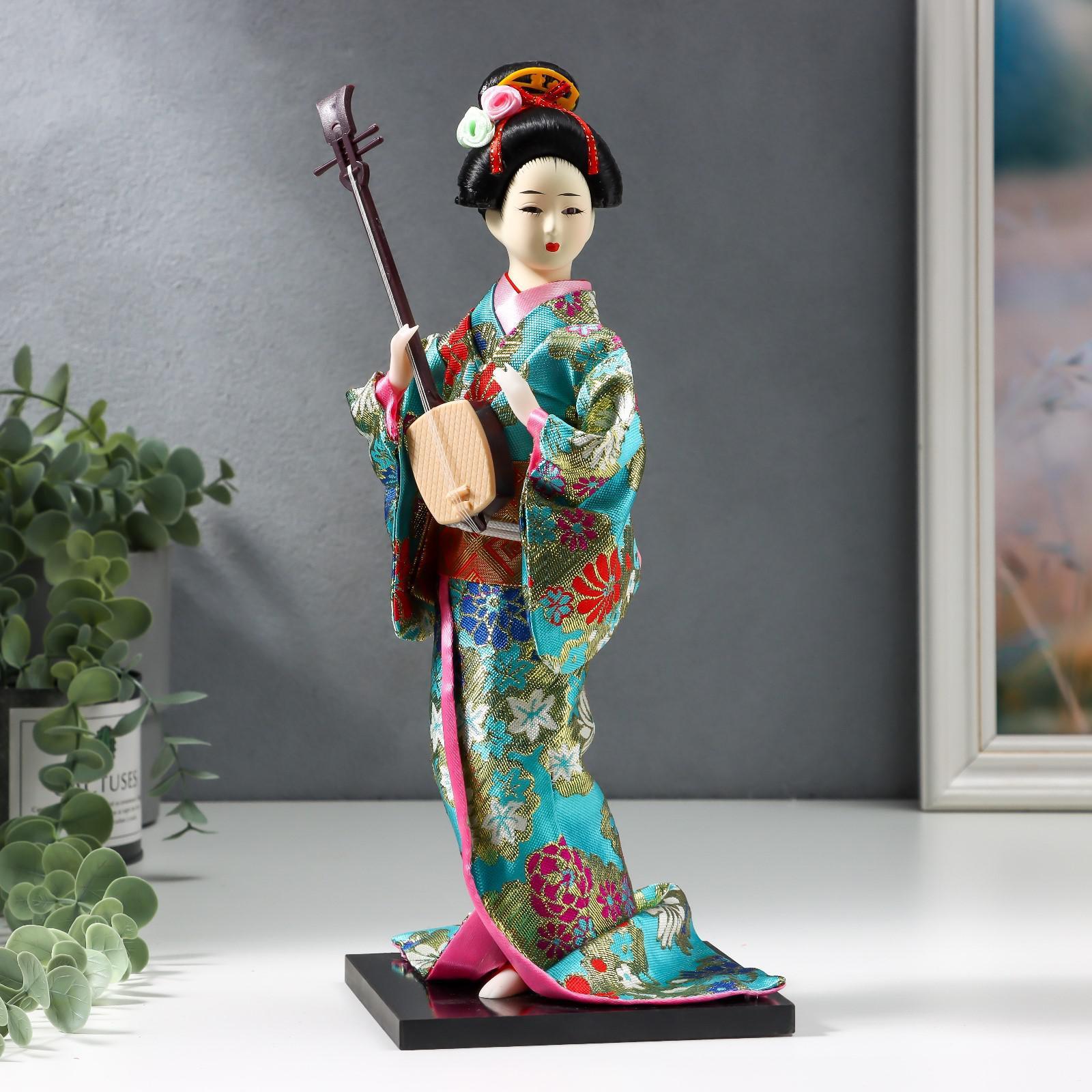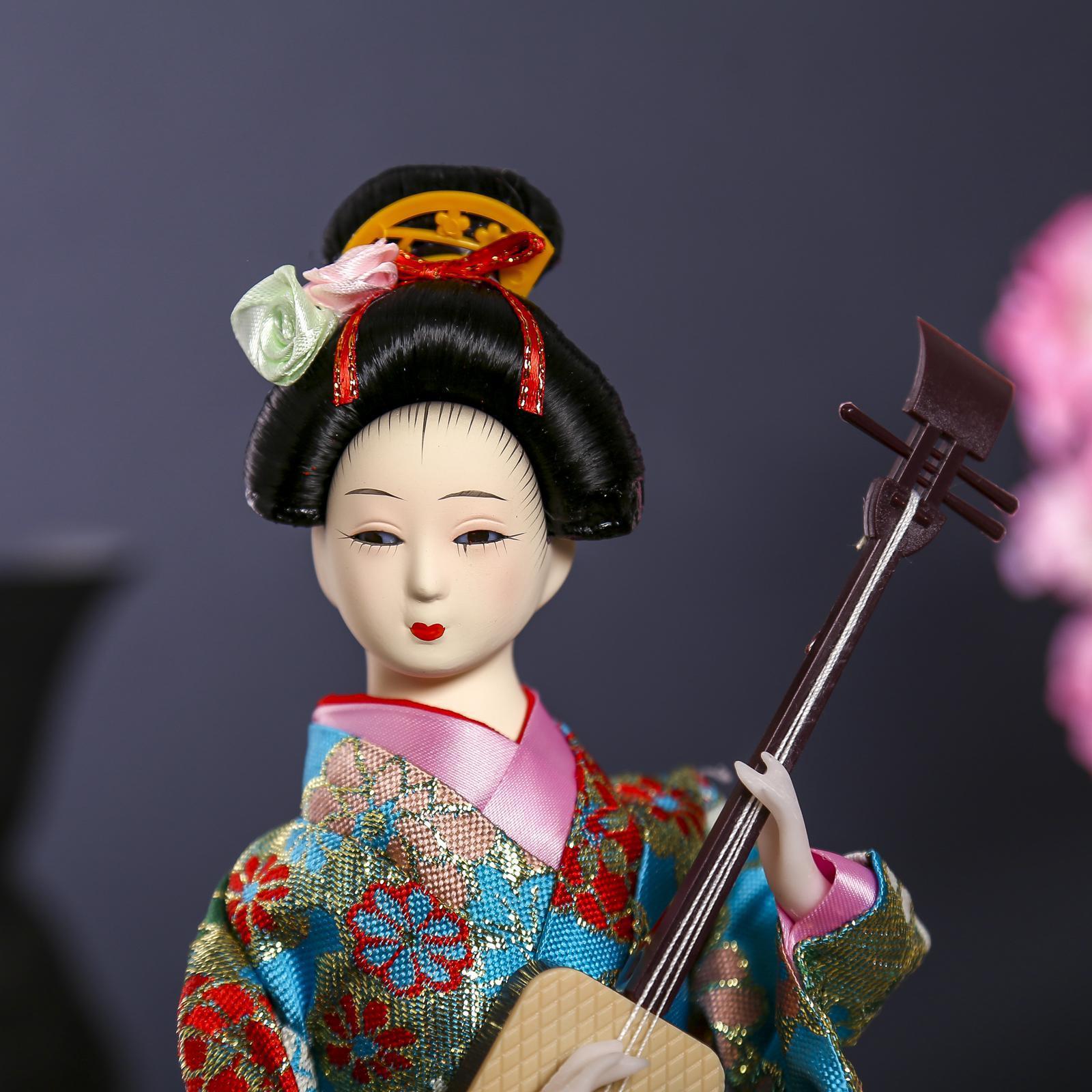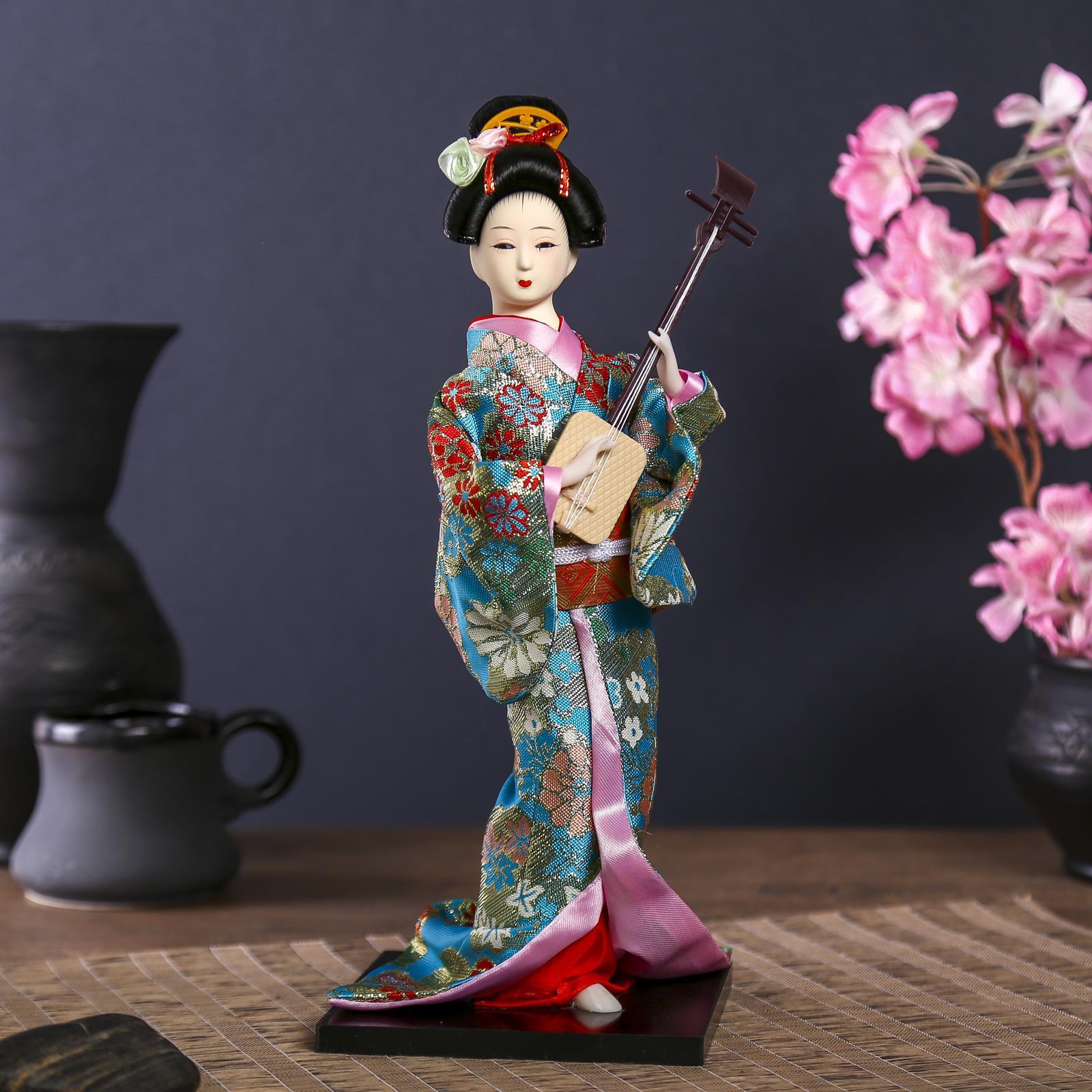 Кукла коллекционная "Гейша в цветочном кимоно с музыкальным инструментом" 30 см