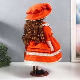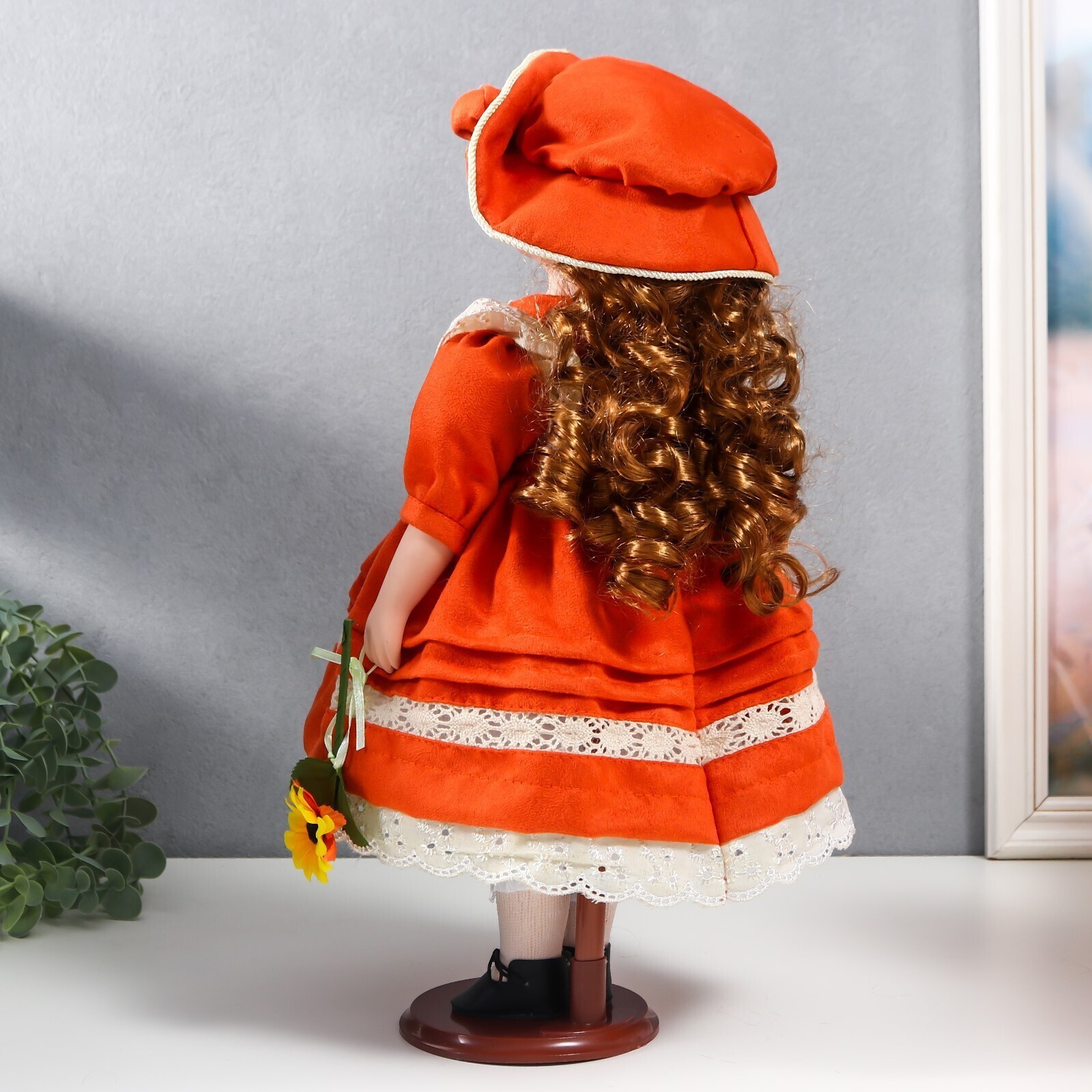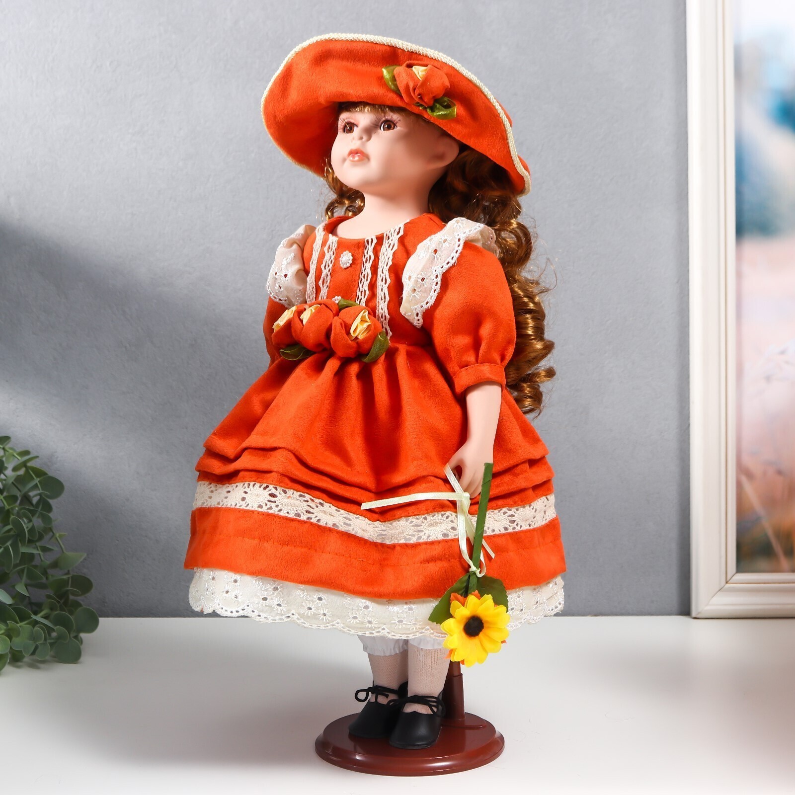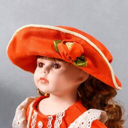 Кукла коллекционная керамика "Вера в ярко-оранжевом платье и шляпе с розами" 40 см