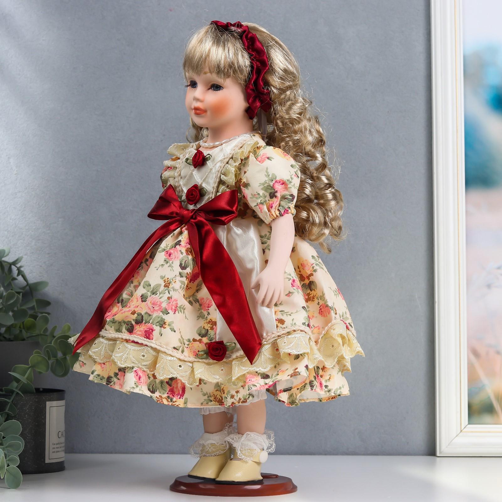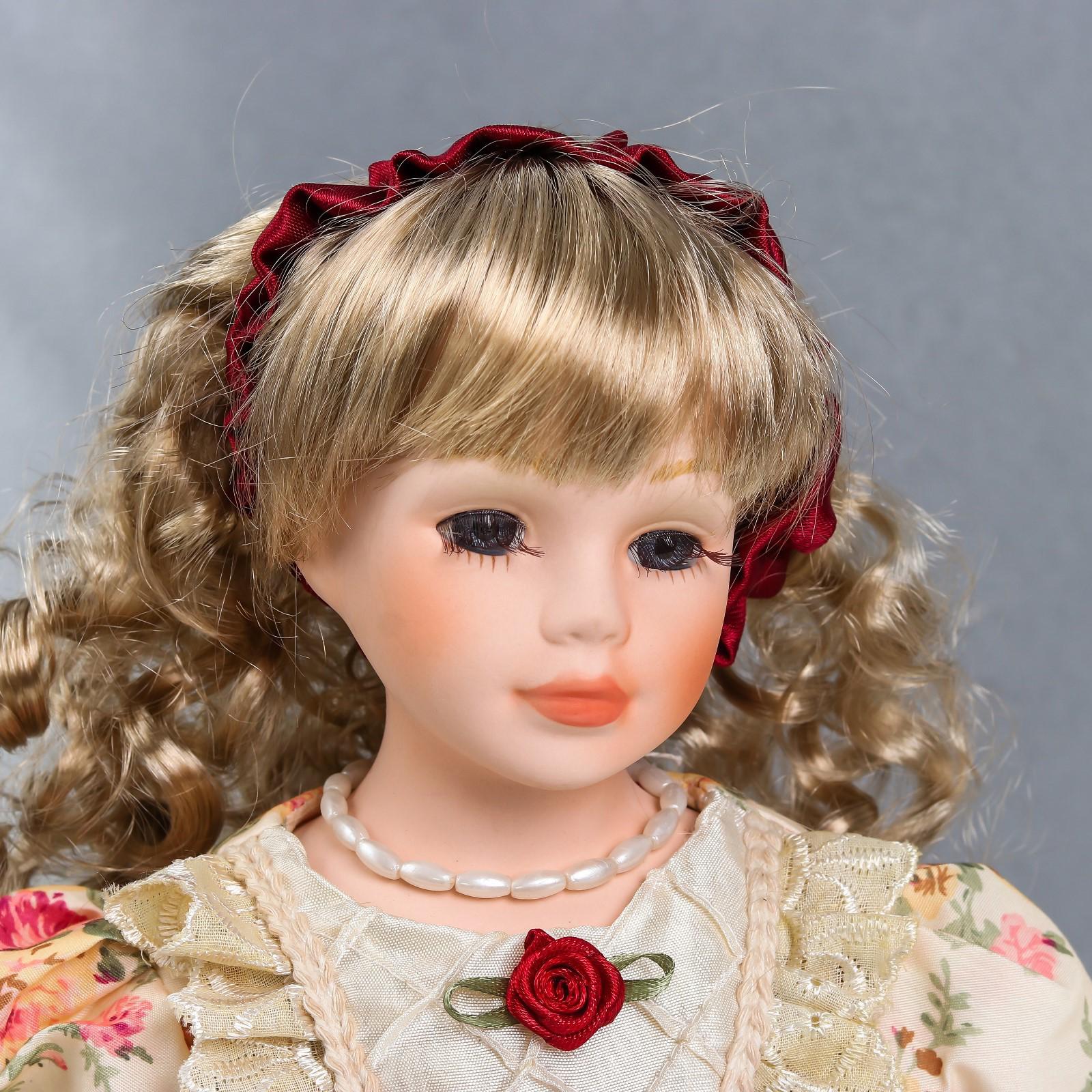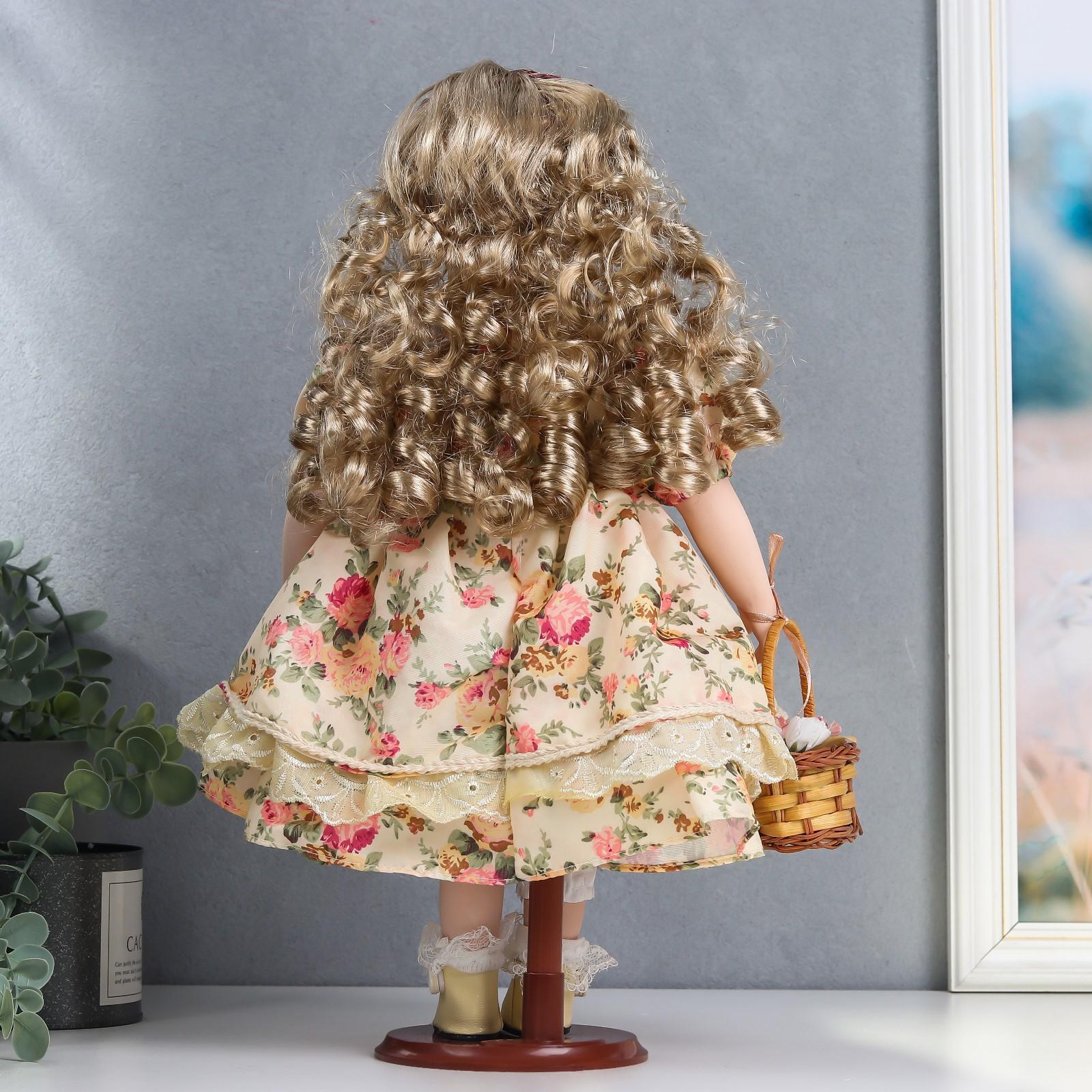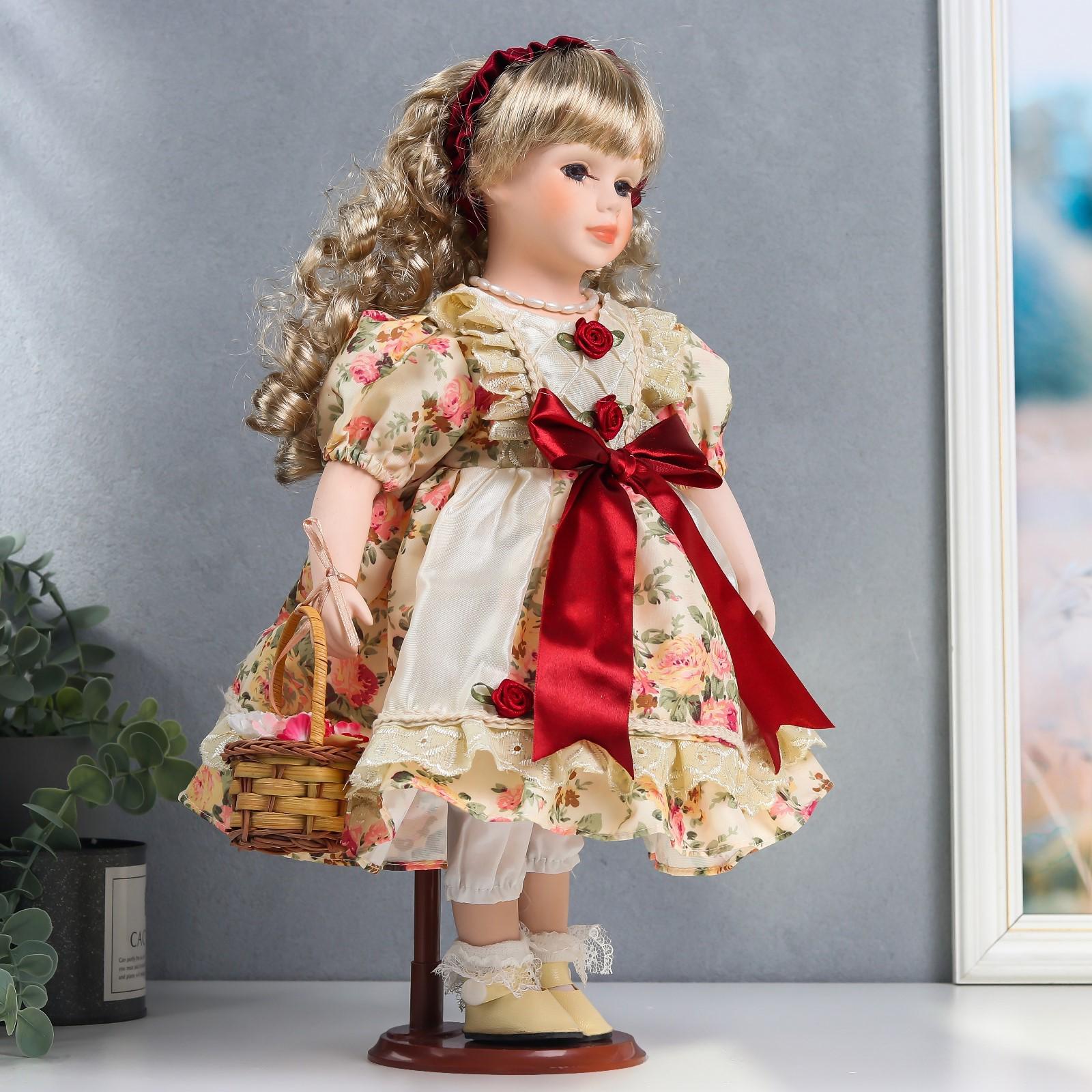 Кукла коллекционная керамика "Алла в платье с цветами, и бордовым бантом, с корзиной" 40 см 626094