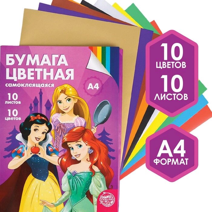 Бумага самоклеящаяся "Принцессы Дисней", А4, 10 л., 10 цв., Disney, 70 г/м2