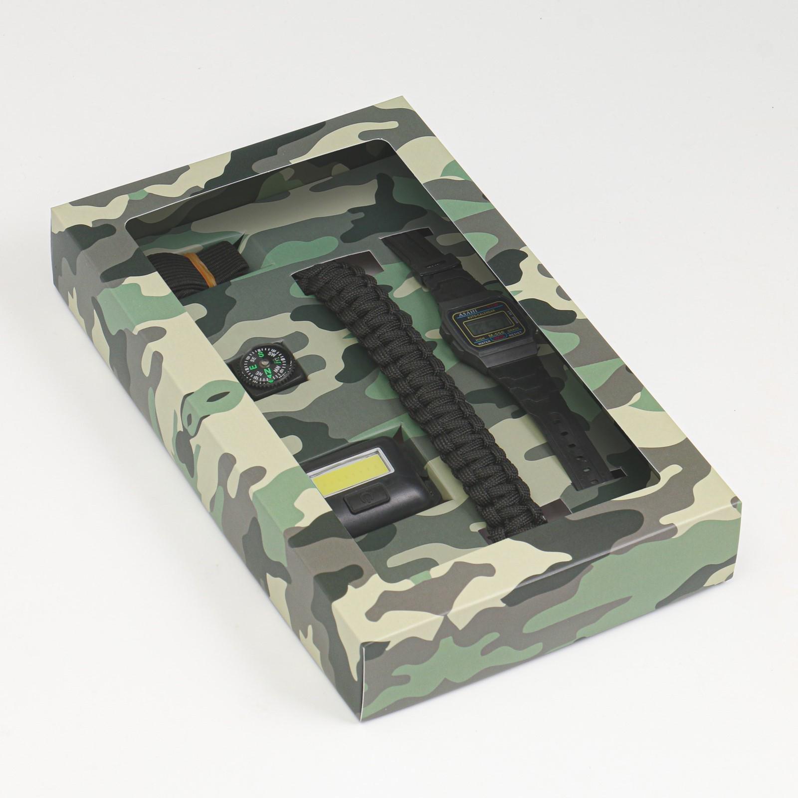 Подарочный набор 4 в 1: наручные часы, компас, фонарь, браслет для выживания