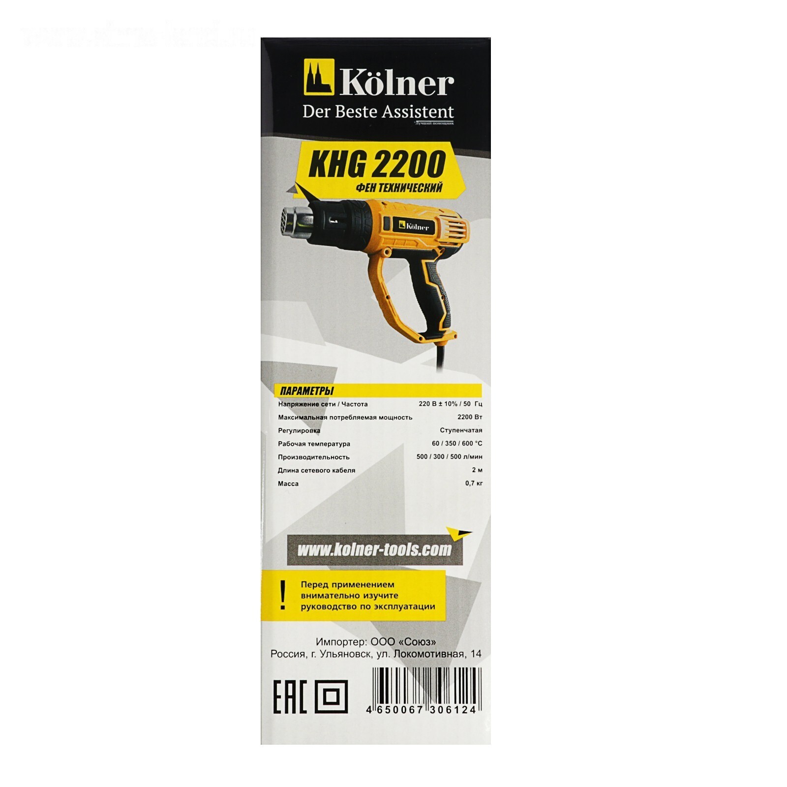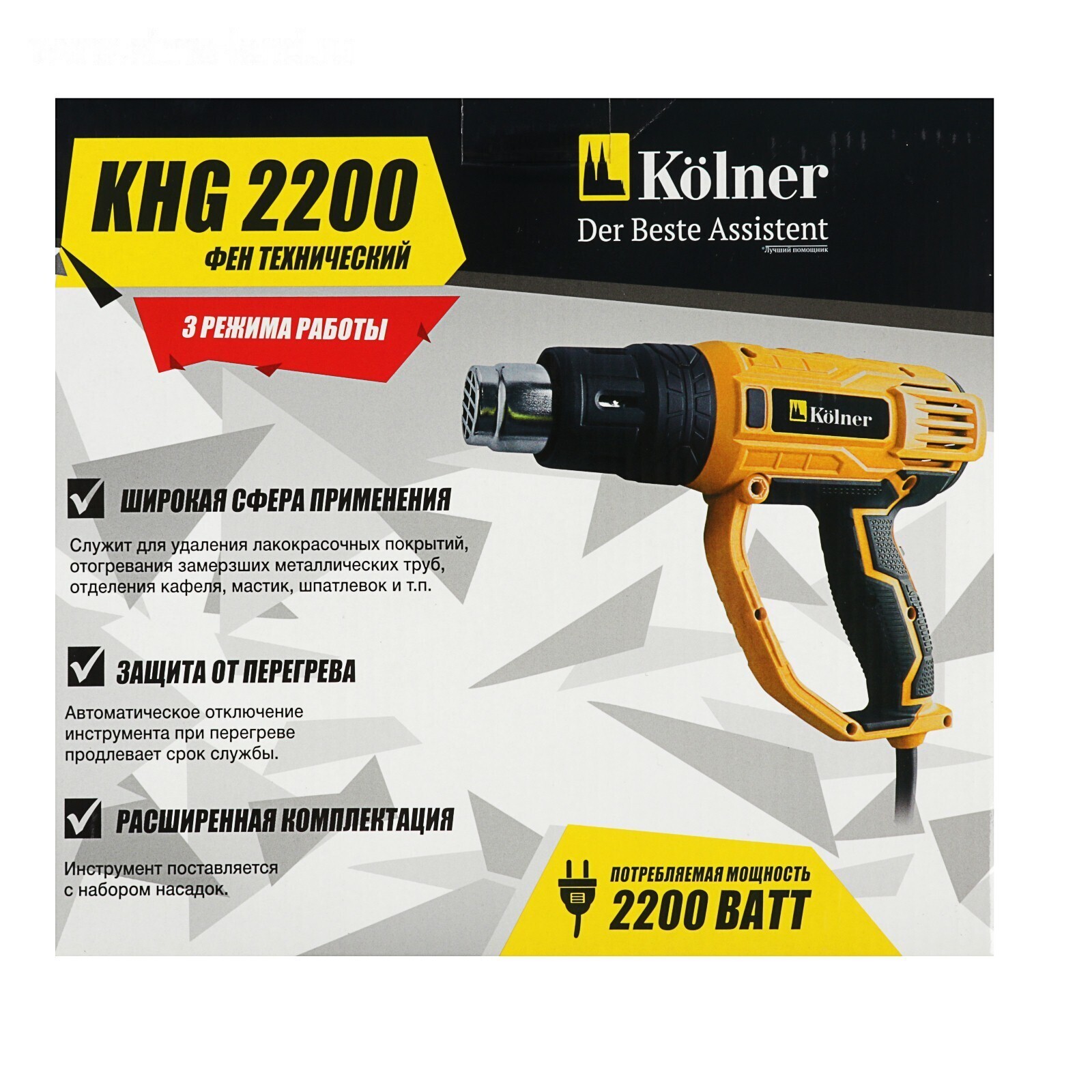 Фен технический Kolner KHG 2200, 2200 Вт, 500/300/500 л/мин, 60/350/600 С°, набор насадок