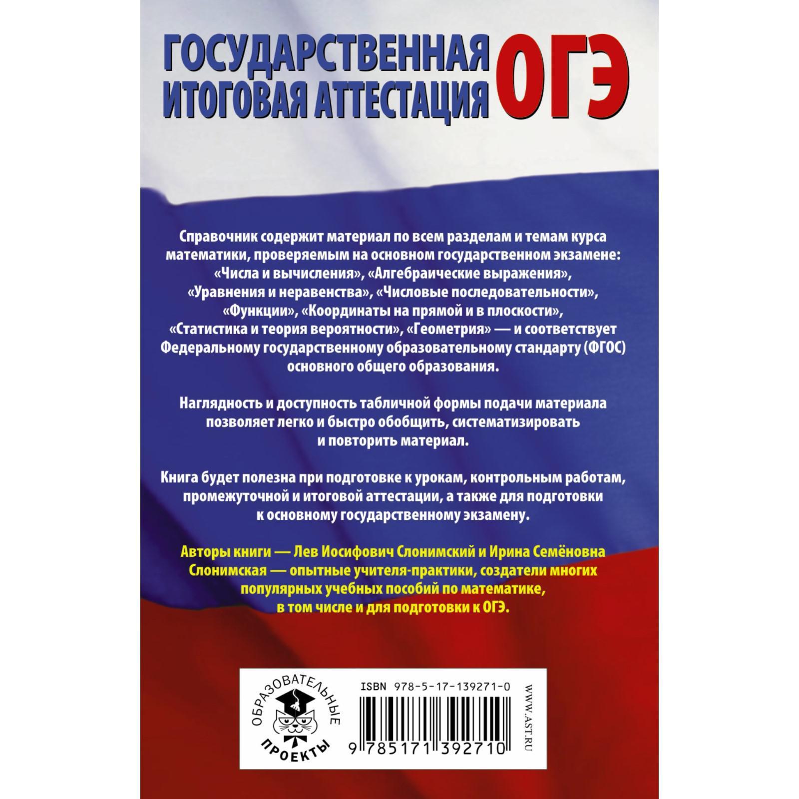Разделы справочника соответствуют кодификатору основного государственного экзамена по математике. Книга будет полезна для повторения и обобщения математических знаний при подготовке к урокам, контрольным и проверочным работам, экзамену в формате ОГЭ.