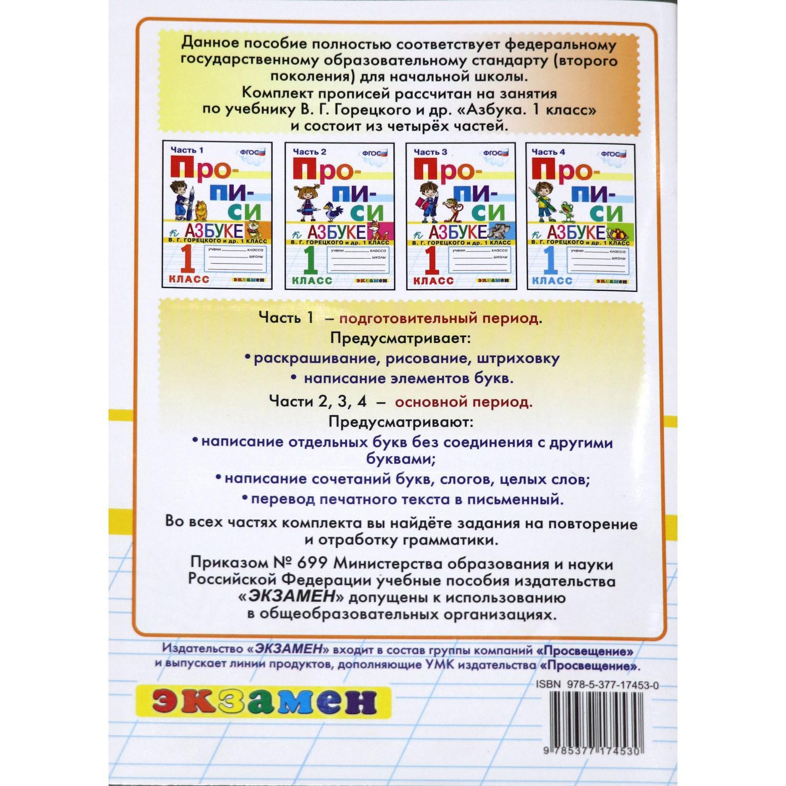 Данное пособие полностью соответствует федеральному государственному образовательному стандарту (второго поколения) для начальной школы. Комплект прописей предназначен для занятий по «Азбуке» В. Г. Горецкого и др. и состоит из четырёх частей. В прописях представлена система работы по обучению письму, которая учитывает возрастные особенности первоклассников. С помощью данного комплекта учащиеся развивают мелкую моторику, формируют каллиграфический почерк, повторяют грамматические правила, учатся переводить печатный текст в письменный. Задания, учитывая требования ФГОС, предусматривают развитие аналитического и творческого мышления. Приказом № 699 Министерства образования и науки Российской Федерации учебные пособия издательства «Экзамен» допущены к использованию в общеобразовательных организациях.