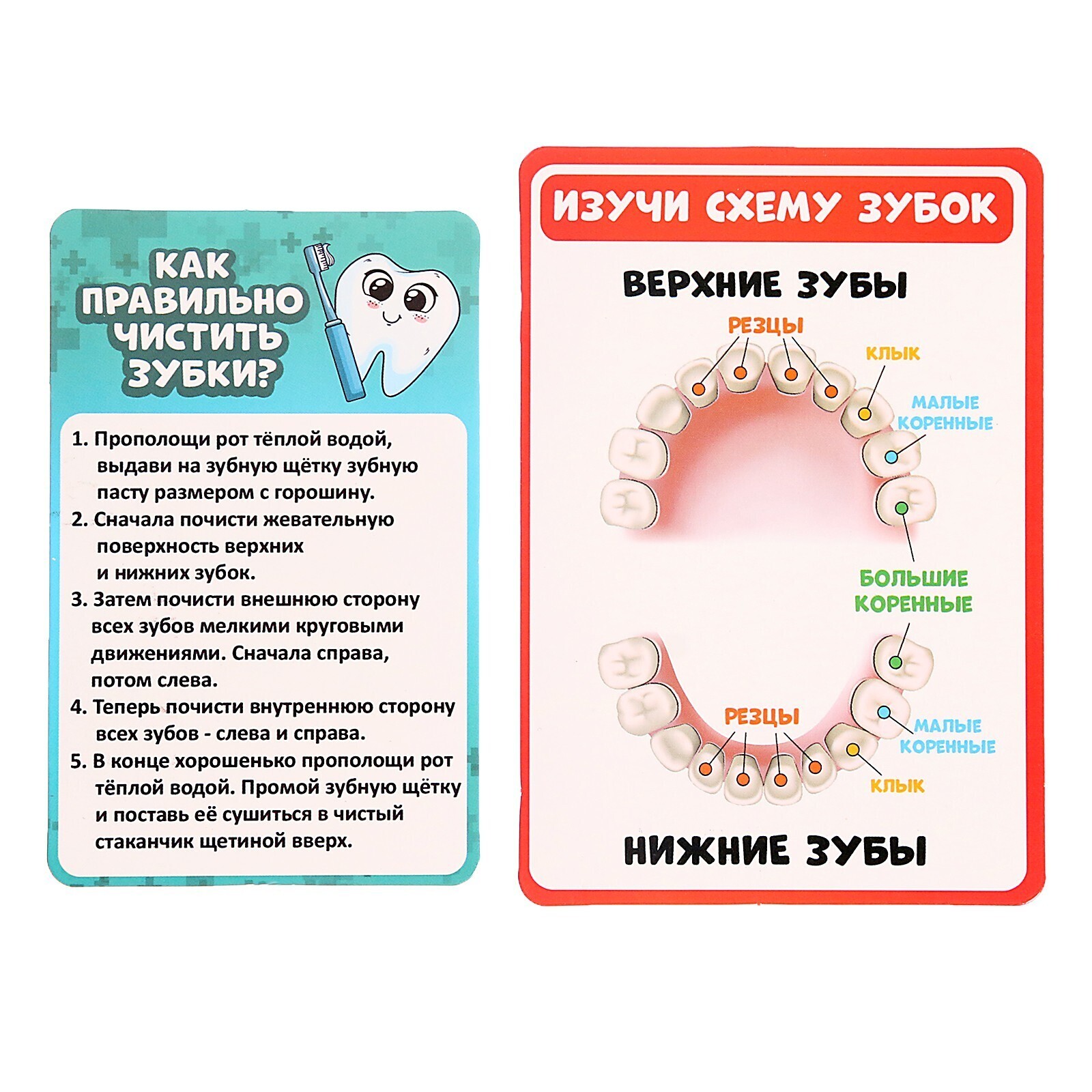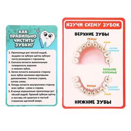 В набор входят инструменты и игровые карточки. Ребёнок узнает о строении челюсти, названия зубов и правила гигиены полости рта.