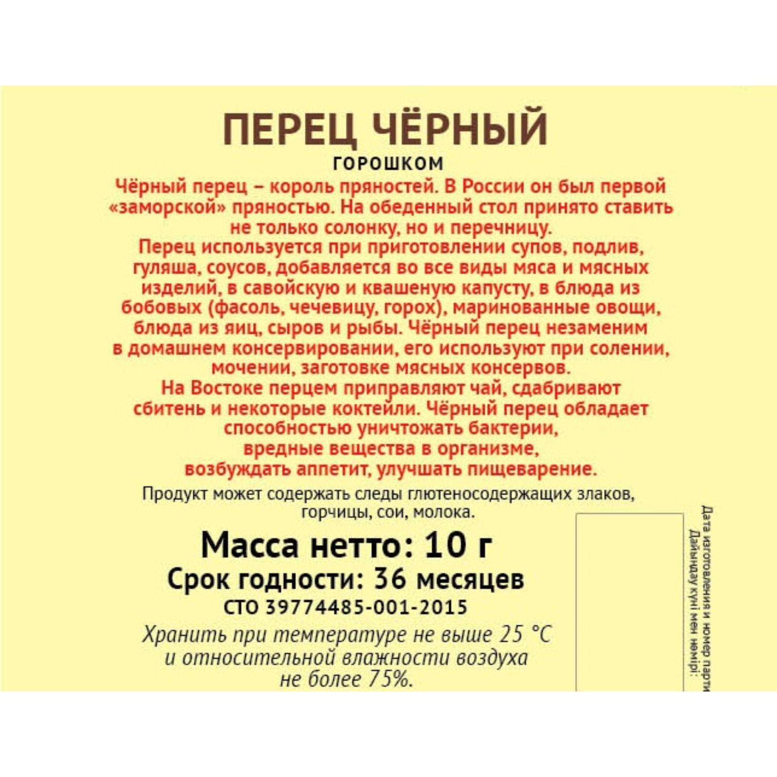 Состав: перец чёрный горошком. Продукт может содержать следы глютеносодержащих злаков, горчицы, сои, молока.